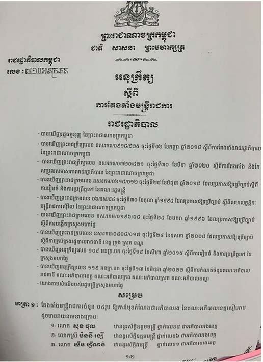 ភ្នំពេញ៖ សម្ដេចតេជោ ហ៊ុន សែន នាយករដ្ឋមន្ត្រីនៃកម្ពុជា បានចេញអនុក្រឹត្យមួយតែងតាំងអភិបាលរងខេត្តសៀមរាបចំនួន ៤នាក់បន្ថែមទៀត។
