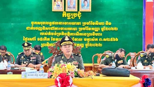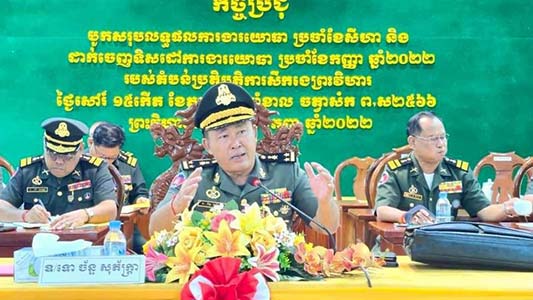 ព្រះវិហារ ៖ កាលពីថ្ងៃទី១០ ខែកញ្ញា ឆ្នាំ២០២២ ឧត្តមសេនីយ៍ទោ ច័ន្ទ សុភ័ក្ត្រា មេបញ្ជាការតំបន់ប្រតិបត្តិការសឹករងព្រះវិហារ បានដឹកនាំកិច្ចប្រជុំ បូកសរុបលទ្ធផល ការងារយោធា ប្រចាំខែសីហា និងដាក់ចេញទិសដៅការងារយោធា ប្រចាំខែកញ្ញា ឆ្នាំ ២០២២និងបំពាក់ឋារនន្ដរសកិ្ដ ជូនដល់នាយទាហាន ចំណុះទីបញ្ជាការតំបន់ប្រតិបត្តិការសឹករងព្រះវិហារ ។