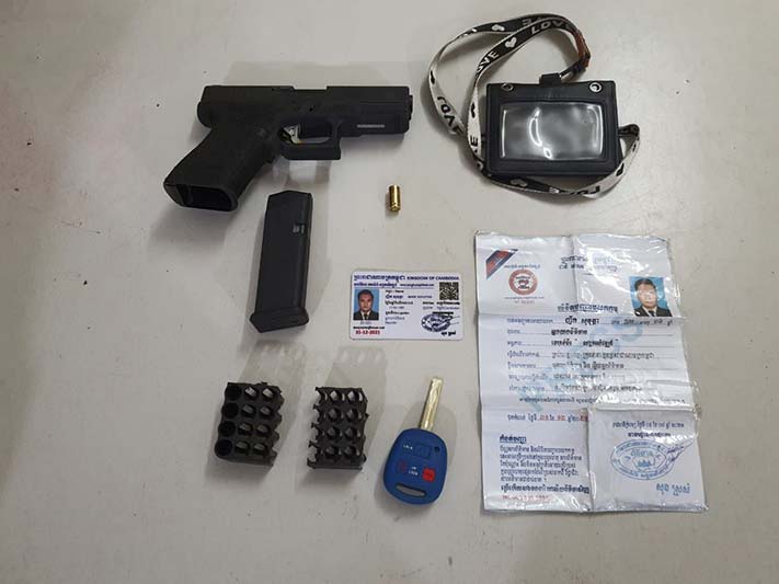 កណ្តាល ៖ បុរសម្នាក់មានកាន់កាតកាសែត បានធ្វើសកម្មភាពជិះម៉ូតូ រួចដកកាំភ្លើងខ្លីបាញ់លើរថយន្តកំពុងធ្វើដំណើរធ្លុះធ្លាយ តែសំណាងល្អបាញ់មិនត្រូវម្ចាស់រថយន្ត ត្រូវបានប៉ូលិសស្ទាក់ចាប់បានភ្លាមៗ កាលពីថ្ងៃទី២៧ ខែកញ្ញា ឆ្នាំ២០២២ វេលាម៉ោង២និង ៣០នាទីរសៀល នៅចំណុចផ្លូវជាតិលេខ៤ ភូមិមនោរម្យ ឃុំបែកចាន ស្រុកអង្គស្នួល ខេត្តកណ្តាល។ប៉ូលិសនិយាយថា ជនរងគ្រោះ២នាក់រួមមាន ១-ឈ្មោះ សួង បូនិច ភេទប្រុស អាយុ៣៤ឆ្នាំ ជនជាតិខ្មែរ មុខរបរបើកបរ នៅភូមិតាសេក សង្កាត់កំបូល ខណ្ឌកំបូល រាជធានីភ្នំពេញ ជាម្ចាស់រថយន្តកាមរី(បាឡែន) និង ២-ឈ្មោះ ណាត បូផាន់ ភេទប្រុស អាយុ២៧ឆ្នាំ ជនជាតិខ្មែរ មុខរបរចុងភៅរោងការ នៅភូមិគម្ពោធស្បូវ ឃុំបែកចាន ស្រុកអង្គស្នួល ខេត្តកណ្ដាល ជាម្ចាស់រថយន្តហាយឡែនឌ័រ ។