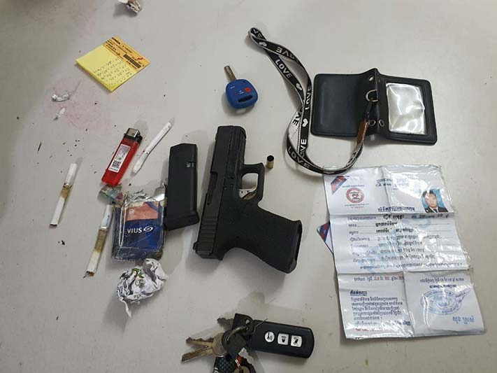 វត្ថុតាងចាប់យករួមមាន ១-អាវុធខ្លីម៉ាក G-Lock19 (ឡុក19របស់USA) RTP75555 ០១ដើម បង់០១ គ្រាប់០១ សំបក កាទូសចំនួន០២ ,២-បណ្ណព័ត៌មាន គេហទំព័រសង្គមអភិវឌ្ឍន៍ ០១ និងលិខិតបញ្ជាបេសកម្ម ០១, ៣-កាបូបស្ពាយសម្រាប់អាវុធ ០១ កូនសោឡានឡិចចស៊ីស ០១ និងជ័រសម្រាប់ដាក់គ្រាប់កាំភ្លើង ចំនួន០២ និង ៤-ម៉ូតូមួយគ្រឿងម៉ាក ADV ពណ៌ស ឆ្នាំ២០២១ ពាក់ស្លាកលេខ ភ្នំពេញ 1JE-3621។