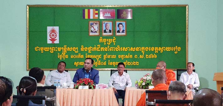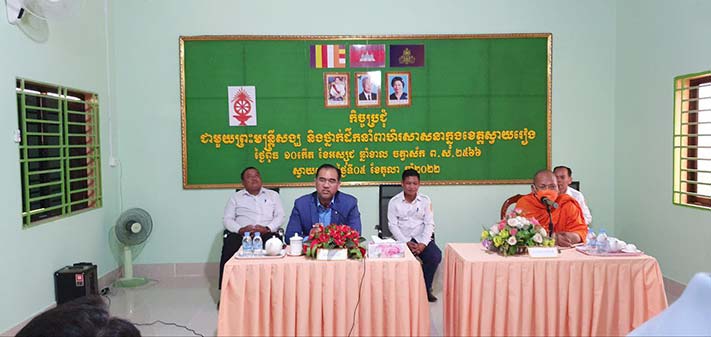 ខេត្តស្វាយរៀង៖ឯកឧត្ដម ម៉ែន អេង អភិបាលរងខេត្តស្វាយរៀងតំណាងឯកឧត្ដម ម៉ែន វិបុល អភិបាលខេត្ត ព្រះវិមិត្តសត្ថា ជុំ ចន្ថា ព្រះរាជាគណៈថ្នាក់កិត្តិយសព្រះវិន័យធរគណខេត្តតំណាងព្រះវិសុទ្ធិញ្ញាណ មុំ សយ ព្រះរាជាគណៈថ្នាក់កិត្តិយសនិងជាព្រះមេគណខេត្តស្វាយរៀងនារសៀលថ្ងៃទី៥ខែតុលាឆ្នាំ២០២២នេះបានអញ្ជើញនិងនិមន្តជួបសំណេះសំណាលជាមួយព្រះមន្ត្រីសង្ឃនិងថ្នាក់ដឹកនាំពាហិរសាសនាក្នុងខេត្តស្វាយរៀង។