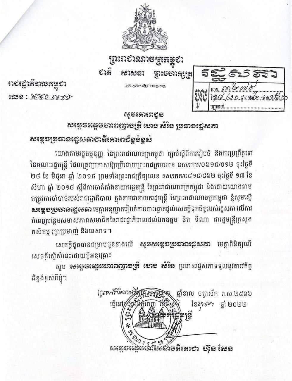 លិខិតសម្តេចតេជោ ហ៊ុន សែន ដែលបណ្តាញព័ត៌មាន Fresh News ទទួលបាន បញ្ជាក់ឱ្យដឹងដូច្នេះថា៖ «យោងតាមរដ្ឋធម្មនុញ្ញ នៃព្រះរាជាណាចក្រកម្ពុជា ច្បាប់ស្តីពីការរៀបចំ និងការប្រព្រឹត្តទៅ នៃគណៈរដ្ឋមន្ត្រី ដែលត្រូវប្រកាសឱ្យប្រើដោយព្រះរាជក្រមលេខ នស/រកម/០៦១៨/០១២ ចុះថ្ងៃទី ២៨ ខែ មិថុនា ឆ្នាំ ២០១៨ ព្រមទាំងព្រះរាជក្រឹត្យលេខ នស/រកត/០៨១៨/៨៦២ ចុះថ្ងៃទី ១៧ ខែ សីហា ឆ្នាំ២០១៨ ស្តីពីការចាត់តាំងនាយករដ្ឋមន្ត្រី នៃព្រះរាជាណាចក្រកម្ពុជា និងដោយយោងតាម តម្រូវការចាំបាច់របស់រាជរដ្ឋាភិបាល ក្នុងនាមជានាយករដ្ឋមន្ត្រី នៃព្រះរាជាណាចក្រកម្ពុជា ខ្ញុំសូមស្នើ សម្តេចប្រធានរដ្ឋសភា មេត្តាអនុញ្ញាតរៀបចំការបោះឆ្នោតផ្តល់សេចក្តីទុកចិត្តរបស់រដ្ឋសភា លើការបំពេញបន្ថែមសមាសភាពសមាជិកនៃរាជរដ្ឋាភិបាលដល់ ឯកឧត្តម ឌិត ទីណា រដ្ឋមន្ត្រីក្រសួង កសិកម្ម រុក្ខាប្រមាញ់ និងនេសាទ»។