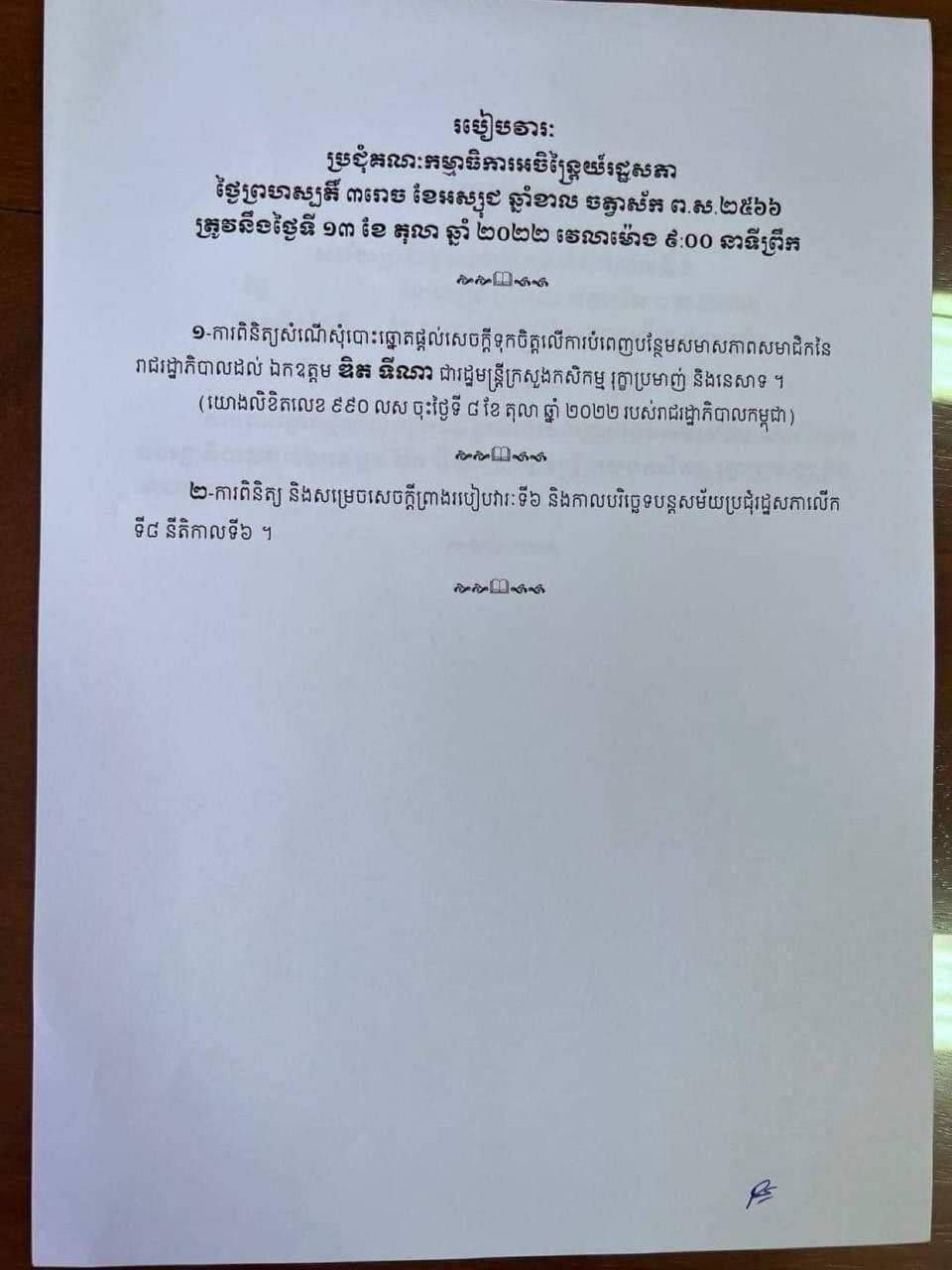 បើតាមលិខិតរបស់រដ្ឋសភា បានឱ្យដឹងថា រដ្ឋសភា នឹងបើកកិច្ចប្រជុំគណៈកម្មាធិការអចិន្ត្រៃយ៍ នៅថ្ងៃព្រហស្បតិ៍ ទី១៣ ខែតុលា ឆ្នាំ២០២២ ខាងមុខនេះ ដើម្បីពិនិត្យលើសំណើរបស់ រាជរដ្ឋាភិបាលក្នុងការបោះឆ្នោតផ្តល់សេចក្តីទុកចិត្តរបស់រដ្ឋសភា លើការបំពេញបន្ថែមសមាសភាពសមាជិក នៃរាជរដ្ឋាភិបាលដល់ លោក ឌិត ទីណា រដ្ឋមន្ត្រីក្រសួង កសិកម្ម រុក្ខាប្រមាញ់ និងនេសាទ។