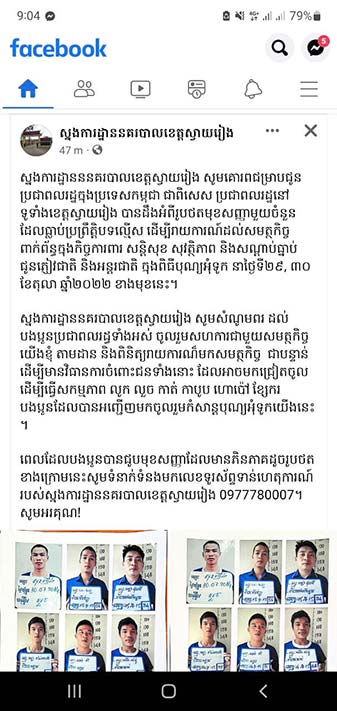 ខេត្តស្វាយរៀង៖យោងតាមផេកFacebookរបស់ស្នងការដ្ឋានននគរបាលខេត្តស្វាយរៀង សូមគោរពជម្រាបជូនប្រជាពលរដ្ឋក្នុងប្រទេសកម្ពុជា ជាពិសេស ប្រជាពលរដ្ឋនៅទូទាំងខេត្តស្វាយរៀង បានដឹងអំពីរូបថតមុខសញ្ញាមួយចំនួនដែលធ្លាប់ប្រព្រឹត្តិបទល្មើស ដើម្បីរាយការណ៍ដល់សមត្ថកិច្ចពាក់ព័ន្ធក្នុងកិច្ចការពារ សន្តិសុខ សុវត្ថិភាព និងសណ្តាប់ធ្នាប់ ជូនភ្ញៀវជាតិ និងអន្តរជាតិ ក្នុងពិធីបុណ្យអុំទូក នាថ្ងៃទី29, 30 ខែតុលា ឆ្នាំ2022 ខាងមុខនេះ។