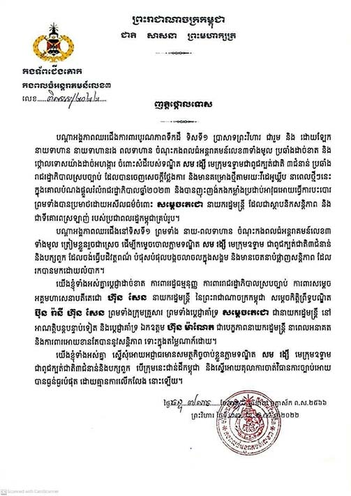 ព្រះវិហារ៖ នាយទាហាន នាយទាហានរង ពលទាហានទូទាំងអង្គភាពវរះសេនាតូចវិស្វកម្មកងពលធំអន្តរាគមន៍លេខ៣ សូម ប្រឆាំងដាច់ខាត ថ្កោលទោសយ៉ាងដាច់អហង្ការ ចំពពោះសំដីទណ្ឌិតសមរស្សីមេក្រុមឧទ្ទាម ជាពូជក្បត់ជាតិបីជំនាន់ និងបក្សពួក ដែលចង់ធ្វើបដិវត្តពណ៌បំផុសបំផុលបង្កចលាចលក្នុងសង្គមនិងមានចេត្តនាបំផ្លាញសន្តិភាព។