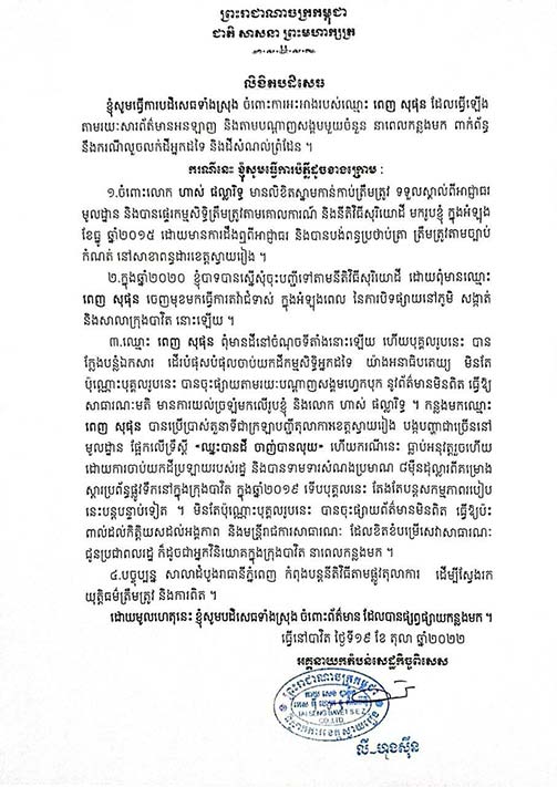 ៣.ឈ្មោះ ពេញ សុផុន ពុំមានដីនៅចំណុចទីតាំងនោះឡើយ ហើយបុគ្គលរូបនេះ បាន ក្លែងបន្លំឯកសារ ដើរបំផុសបំផុលចាប់យកដីកម្មសិទ្ធិអ្នកដទៃ យ៉ាងអនាធិបតេយ្យ មិនត ប៉ុណ្ណោះបុគ្គលរូបនេះ បានចុះផ្សាយតាមរយៈបណ្តាញសង្គមហ្វេកបុក នូវព័ត៌មានមិនពិត ធ្វើឱ្យ សាធារណៈមតិ មានការយល់ច្រឡំមកលើរូបខ្ញុំ និងលោក ហាស់ ផល្លារិទ្ធ ។ កន្លងមកឈ្មោះ ពេញ សុផុន បានប្រើប្រាស់តួនាទីជាក្រឡាបញ្ជីតុលាការខេត្តស្វាយរៀង បង្កបញ្ហាជាច្រើននៅ មូលដ្ឋាន ផ្អែកលើទ្រឹស្តី «ឈ្នះបានដី ចាញ់បានលុយ» ហើយករណីនេះ ធ្លាប់អនុវត្តរួចហើយ ដោយការចាប់យកដីប្រឡាយរបស់រដ្ឋ និងបានទាមទារសំណងប្រមាណ ៨ម៉ឺនដុល្លារពីគម្រោង ស្តារប្រព័ន្ធផ្លូវទឹកនៅក្នុងក្រុងបាវិត ក្នុងឆ្នាំ២០១៩ ទើបបុគ្គលនេះ តែងតែបន្តសកម្មភាពរបៀប នេះបន្តបន្ទាប់ទៀត ។ មិនតែប៉ុណ្ណោះបុគ្គលរូបនេះ បានចុះផ្សាយព័ត៌មានមិនពិត ធ្វើឱ្យប៉ះ ពាល់ដល់កិត្តិយសដល់អង្គភាព និងមន្រ្តីរាជការសាធារណៈ ដែលខិតខំបម្រើសេវាសាធារណៈ ជូនប្រជាពលរដ្ឋ ក៏ដូចជាអ្នកវិនិយោគក្នុងក្រុងបាវិត នាពេលកន្លងមក ។៤.បច្ចុប្បន្ន សាលាដំបូងរាធានីភ្នំពេញ កំពុងបន្តនីតិវិធីតាមផ្លូវតុលាការ ដើម្បីស្វែងរក យុត្តិធម៌ត្រឹមត្រូវ និងការពិត ។ ដោយមូលហេតុនេះ ខ្ញុំសូមបដិសេធទាំងស្រុង ចំពោះព័ត៌មាន ដែលបានផ្សព្វផ្សាយកន្លងមក ។ដោយ៖ មិន ភក្ដី