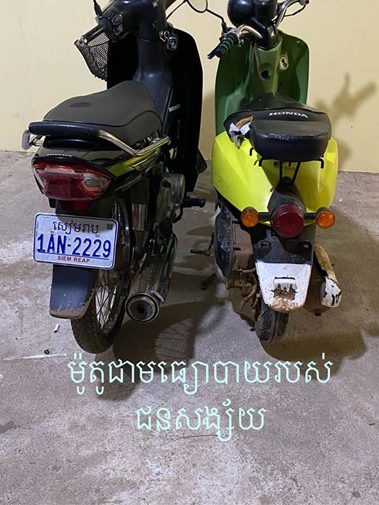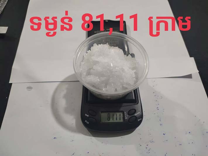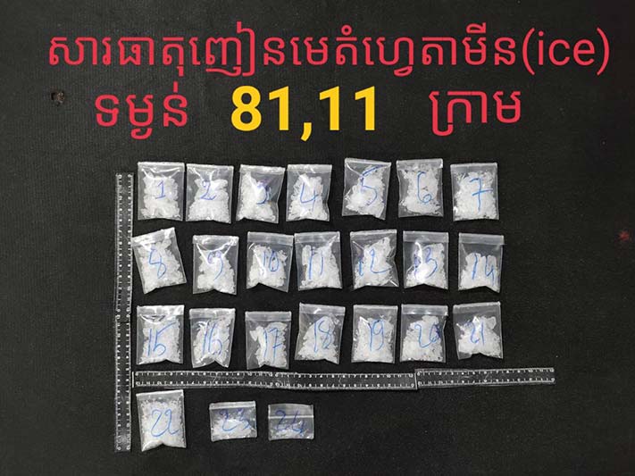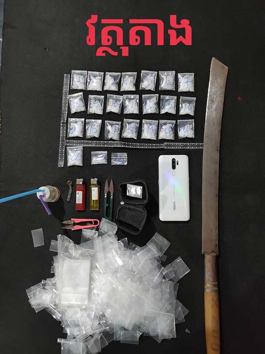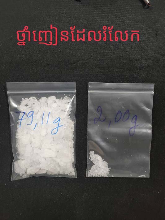 វត្ថុតាងចាប់យករួមមាន សារធាតុញៀនមេតំហ្វេតាមីន(ice)ចំនួន ២៤កញ្ចប់(កញ្ចប់ធំ ២២ និង កញ្ចប់តូច ០២ ) ទម្ងន់81 ,11ក្រាម , ឧបករណ៍វេចខ្ចប់ និង ប្រើប្រាស់សារធាតុញៀនមួយចំនួន ,ទូរសព្ទចំនួន ០២ គ្រឿង, ម៉ូតូជាមធ្យោបាយធ្វើសកម្មភាព២ គ្រឿងម៉ាកហុងដា ពាក់ស្លាកលេខ សៀមរាប 1AN-2229 និង ម៉ាកTODAY គ្មានស្លាកលេខ , ដាវ ចំនួន ០១ ដើមនិង ក្រដាស់ Wing វេរលុយ ចំនួន ០៤ សន្លឹក ។