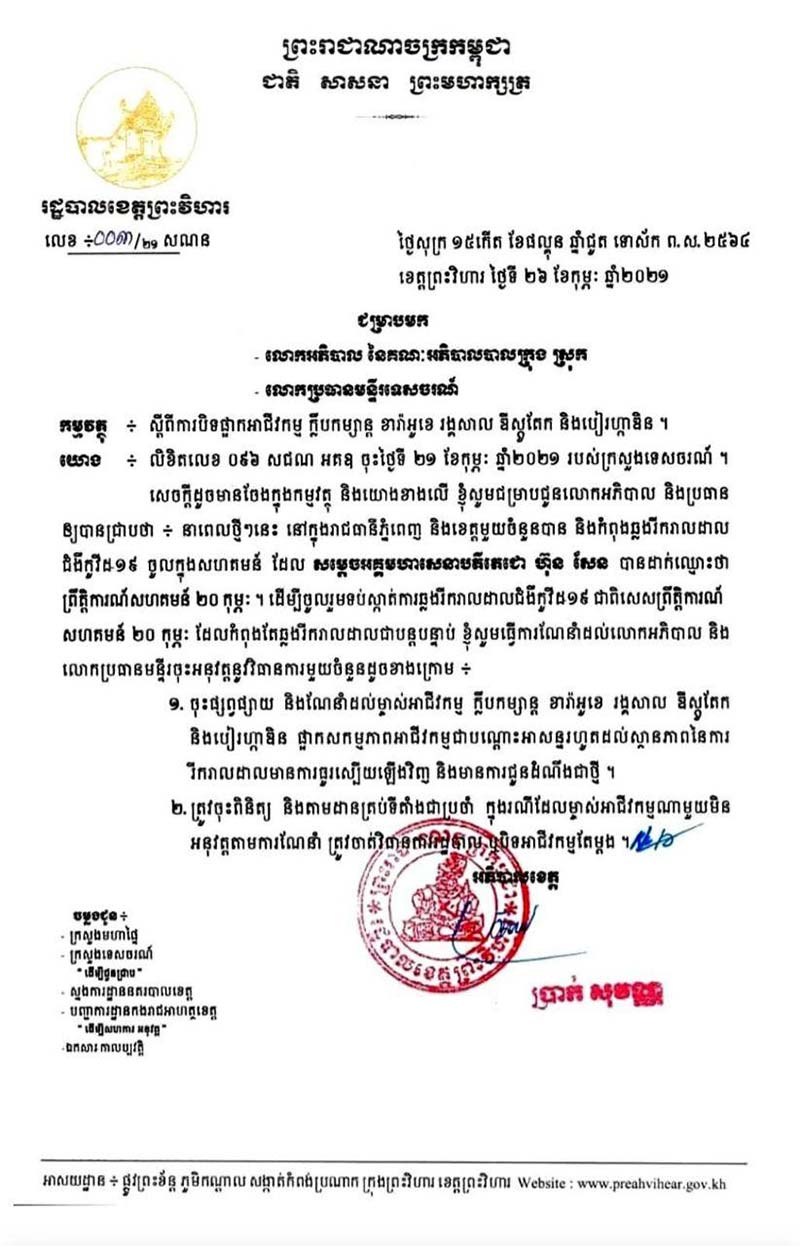 ព្រះវិហារៈ រដ្ឋបាលខេត្តព្រះវិហារ នៅថ្ងៃទី២៦ ខែកុម្ភៈ ឆ្នាំ២០២១ បានចេញសេចក្តីជូនដំណឹងមួយ ឲ្យផ្អាកអាជីវកម្ម ក្លឹបកម្សាន្ដ ខារ៉ាអូខេ រង្គសាល ឌីស្កូតែក និងបៀរហ្កាដិន ដើម្បីទប់ស្កាត់ការរីករាលដាល នៃជំងឺកូវីដ-១៩ក្នុងសហគមន៍។ សេចក្ដីជូនដំណឹងរបស់លោក ប្រាក់ សុវណ្ណ អភិបាលខេត្ដព្រះវិហារ ដែល ទទួលបានលោកបានណែនាំ អភិបាលក្រុង ស្រុក និងមន្ទីរទេសចរខេត្ត ត្រូវចុះផ្សព្វផ្សាយ និងណែនាំដល់ម្ចាស់អាជីវកម្មក្លឹបកម្សាន្ដនានា ត្រូវផ្អាកសកម្មភាពអាជីវកម្មជាបណ្តោះអាសន្ន រហូតដល់ស្ថានភាព នៃការរីករាលដាលនៃជំងឺកូវីដ-១៩ មានការធូរស្បើយឡើងវិញ។ក្នុងសេចក្ដីជូនដំណឹងដដែលនោះ លោកអភិបាលខេត្ត ក៏បានប្រាប់អាជ្ញាធរក្រុង ស្រុក និងសមត្ថកិច្ចពាក់ព័ន្ធ ត្រូវចុះពិនិត្យ និងតាមដានគ្រប់ទីតាំងជាប្រចាំ ក្នុងករណីដែលម្ចាស់អាជីវកម្មណាមួយ មិនអនុវត្តន៍តាមការណែនាំ ត្រូវចាត់វិធានការរដ្ឋបាល ឬបិទអាជីវកម្មតែម្តង៕