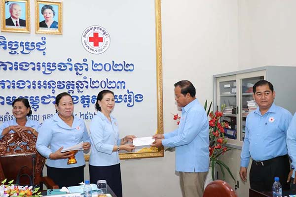 បន្ទាប់ពីបញ្ចប់កិច្ចប្រជុំលោកជំទាវអនុប្រធានអចិន្ត្រៃយ៍គណៈកម្មាធិការសាខា បានប្រគល់ថវិកាដែលបានចំណេញពីការលក់សន្លឹកឆ្នោត ដល់អនុសាខាក្រុង ស្រុកទាំង ៨ និងថវិកាឧបត្ថម្ភប្រចាំខែរបស់ឯកឧត្តម នាយឧត្តមសេនីយ៍ ចៅ ភិរិទ្ធ ចំនួន ១,០០០ ដុល្លារ ដល់អនុសាខាស្រុកស្វាយជ្រំដើម្បីទិញសម្ភារៈ ត្រៀមបម្រុងឆ្លើយតបដល់ប្រជាពលរដ្ឋងាយរងគ្រោះក្នុងស្រុក ។