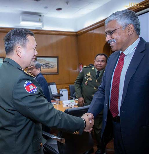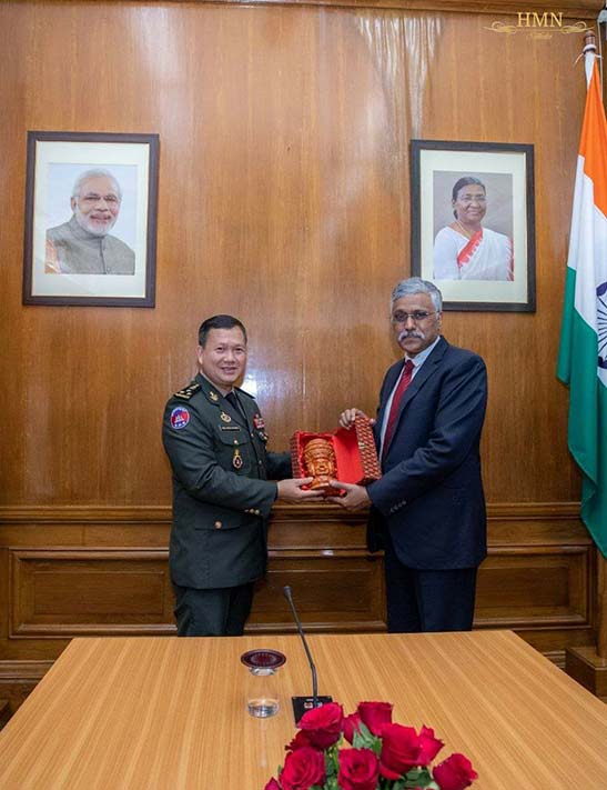 ភ្នំពេញ៖ នៅថ្ងៃទី០៣ ខែកុម្ភៈ ឆ្នាំ២០២៣ ឯកឧត្តម ឧត្តមសេនីយ៍ឯក ហ៊ុន ម៉ាណែត អគ្គមេបញ្ជាការរងនៃកងយោធពលខេមរភូមិន្ទ មេបញ្ជាការកងទ័ពជើងគោក បានអញ្ជើញចូលជួបសម្តែងការគួរសម និងពិភាក្សាការងារជាមួយនឹង ឯកឧត្តម ជីរីដា អារ៉ាម៉ានី (Giridhar Aramane) អគ្គលេខាធិការនៃក្រសួងការពារជាតិឥណ្ឌា ក្នុងឱកាសនៃដំណើរបំពេញទស្សនកិច្ចផ្លូវការនៅរដ្ឋធានីញ៉ូដេលី សាធារណរដ្ឋឥណ្ឌា។