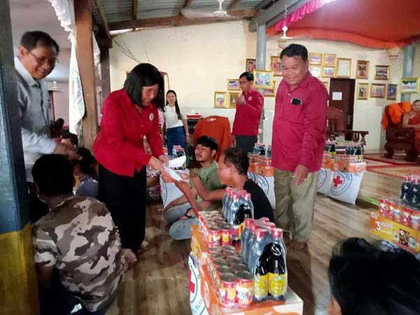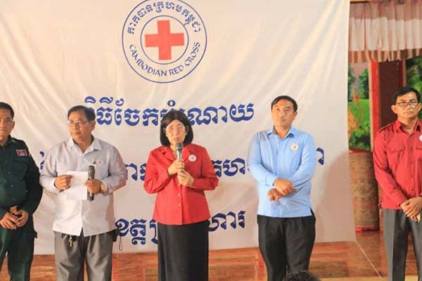 នាឱកាសនោះ លោកជំទាវ ចឹក ហេង អនុប្រធានអចិន្ត្រៃយ៍ គណៈកម្មាធិការសាខាខេត្ត បាននាំមកនូវសេចក្តីនឹករលឹករបស់ឯកឧត្តម គីម រិទ្ធី ប្រធានគណ:កម្មាធិការសាខា ជាពិសេសសម្តេចកិត្តិព្រឹទ្ធបណ្ឌិត ប៊ុន រ៉ានី ហ៊ុនសែន ប្រធានកាកបាទក្រហមកម្ពុជា ផ្តាំផ្ញើសួរសុខទុក្ខដល់បងប្អូនប្រជាពលរដ្ឋ ដោយក្តីអាណិតអាសូរ និងសោកស្តាយជាទីបំផុត ចំពោះឧប្បទ្ទវហេតុគ្រោះធម្មជាតិដែលបានបំផ្លាញនៅទ្រព្យសម្បត្តិរបស់បងប្អូនដែលរងគ្រោះដោយសារខ្យល់កន្រ្តាក់នាពេលនេះ ព្រមទាំងបានអំពាវនាវដល់ប្រជាពលរដ្ឋទាំងអស់ សូមមានការប្រុងប្រយ័ត្នចំពោះ ផ្គរ រន្ទះ នៅពេលមានភ្លៀងត្រូវបិទទូរទស្សន៍ បិទទូរស័ព្ទ និងស្វែងរកកន្លែងដែលមានសុវត្ថិភាព។សម្ភារៈផ្តល់ជូនក្នុងមួយគ្រួសាររួមមាន៖ អង្ករ ២៥គីឡូក្រាម មី ១កេស ត្រី ខ ១យួរ ទឹកស៊ីអ៉ីវ ១យួរ និងថវិកាចំនួន ៥០,០០០រៀល គ្រួសាររងគ្រោះខូចខាតទាំងស្រុង ទទួលបន្ថែម តង់ចំនួន ១។-ប្រគេនព្រះសង្ឃ÷អង្ករ ៥០គីឡូក្រាម មី ១កេស ត្រីខ ១យួរ ទឹកស៊ីអ៉ីវ ១យួរ បច្ច័យមួយចំនួន ផងដែរ៕