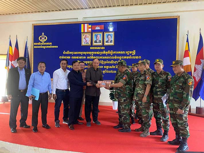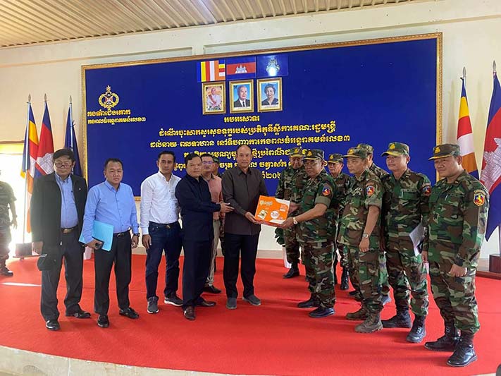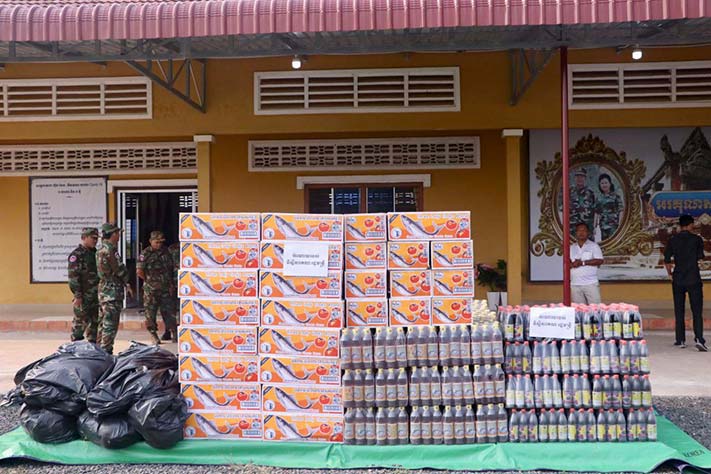 សូមបញ្ជាក់ថា អំណោយជាគ្រឿងឧបភោគ បរិភោគ ដែលទីស្តីការណគៈរដ្ឋមន្ត្រីនាំមកចែកជូន នាយនិងពលទាហាននាពេលនេះ រួមមាន៖ មីជាតិចំនួន១០០០កេស ត្រីខចំនួន៥០កេសធំ ឆៃប៉ូវផ្អែមចំនួន ៥០០គីឡូក្រាម ទឹកត្រីចំនួន២០០យួរ ទឹកក្រូចចម្រុះចំនួន១០០កេស និងទឹកសីវអ៊ីវចំនួន២០០យួរផងដែរ៕