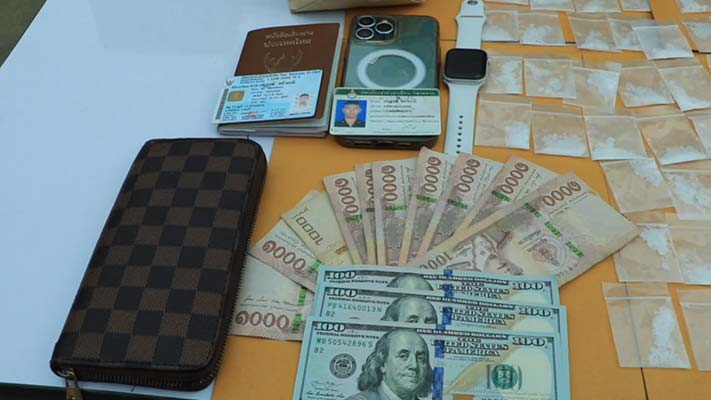 វត្ថុតាងរួមមាន៖ គ្រឿងញៀនប្រភេទ ក្រាមម្សៅពណ៌សថ្លា(ខេ)ចំនួន១៦៤កូនថង់កិប ទម្ងន់១៩១,២ក្រាម (មួយរយ កៅសិបមួយក្បៀសពីរក្រាម ថ្លឹងទាំងសម្បកថង់), -ទូរស័ព្ទចំនួន ០១គ្រឿង (ម៉ាក IPHONE 13Pro ពណ៌ខ្មៅ) -ប្រាក់បាត ចំនួន១០,០០០បាត (មួយម៉ឺនបាត), ប្រាក់ដុល្លារចំនួន ៣០០ដុល្លារ, នាឡិកាដៃ ម៉ាក IWATCH ពណ៌ស ចំនួន ០១គ្រឿង, -សៀវភៅលិខិតឆ្លងដែន ចំនួន ០១ក្បាល, -អត្តសញ្ញាណប័ណ្ណសញ្ជាតិថៃ (Settawoot lamanee) ចំនួន ០១សន្លឹក, កាតទាហ៊ានថៃ ចំនួន ០១សន្លឹក, -ថង់ក្រដាសសម្រាប់ដាក់គ្រឿងញៀន ចំនួន ០១។