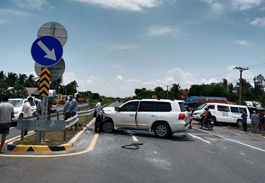 យោងតាមរបាយការណ៍របស់នគរបាលស្រុកកំពង់ត្រឡាច បានឱ្យដឹងថានៅមុនពេលកើតហេតុមានរថយន្តមួយគ្រឿងម៉ាកសាំយ៉ុង ពណ៌ស ពាក់ស្លាកលេខភ្នំពេញ2 AW.28 49 បើកបរដោយបុរសឈ្មោះ សែន អានីន ភេទប្រុសអាយុ 63 ឆ្នាំមានទីលំនៅភូមិច្រករមៀត ឃុំឈូកសស្រុកកំពង់ត្រឡាច បានធ្វើដំណើរដឹកសិស្សចំនួន 4 នាក់ក្នុងដំណើរពីជើងទៅត្បូង លុះមកដល់ចំណុចកើតហេតុក៏បានបត់ឆ្វេង ដើម្បីប្ដូរគន្លង មិនបានប្រយ័ត្នក៏ត្រូវរថយន្តម៉ាកឡង់គ្រីស័រ ពណ៌សពាក់ស្លាកលេខខេមរៈភូមិន្ទ 02.27 778 បើកបរដោយឈ្មោះ អៀង ណារ៉ា ភេទ ប្រុស អាយុ28 ឆ្នាំមានទីលំនៅភូមិឃួច ឃុំក្រោកគោ ស្រុកស្វាយជ្រុំ ខេត្តស្វាយរៀង ក្នុងដំណើរពីត្បូង ទៅជើង ក៍បានបុកគ្នាពេញទំហឹងបណ្ដាលឱ្យរងរបួសមនុស្ស៥ នាក់(ស្រីម្ម្នាក់ )រកក្នុងនោះរបួសធ្ងន់2នាក់ ជាសិស្សសាលានិងខូចខាតរបងសុវត្ថិភាពផ្លូវ 6 ម៉ែត្រ។