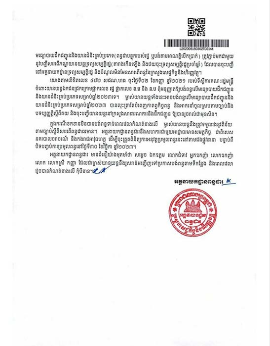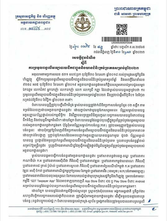 ភ្នំពេញ៖ អគ្គនាយកដ្ឋានពន្ធដារ នៃក្រសួងសេដ្ឋកិច្ច និងហិរញ្ញវត្ថុ នៅថ្ងៃទី៣០ ខែឧសភា ឆ្នាំ២០២៣។បានជូនដំណឹងដល់ពលរដ្ឋជាម្ចាស់យានយន្តថាៈ ការប្រមូលពន្ធលើមធ្យោបាយដឹកជញ្ជូន និងយានជំនិះគ្រប់ប្រភេទស ម្រាប់ឆ្នាំ២០២៣ នឹងចាប់ផ្តើមពីថ្ងៃទី០១ ខែមិថុនា រហូតដល់ថ្ងៃទី៣០ ខែវិច្ឆិកា ឆ្នាំ២០២៣តទៅ។