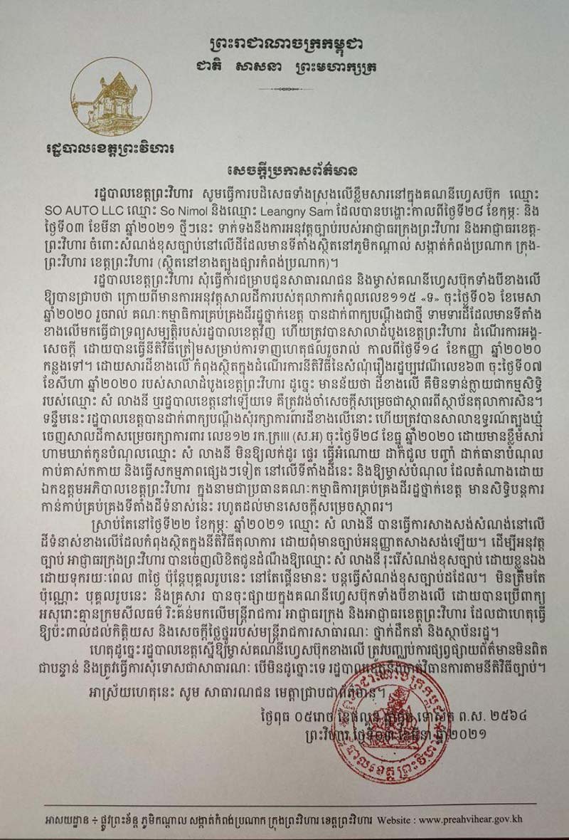 ព្រះវិហារៈ រដ្ឋបាលខេត្តព្រះវិហារ សូមធ្វើការបដិសេធទាំងស្រុងលើខ្លឹមសារនៅក្នុងគណនីហ្វេសប៊ុក ឈ្មោះ SO AUTO LLC ឈ្មោះ So Nimol និងឈ្មោះ Leangny Sam ដែលបានបង្ហោះកាលពីថ្ងៃទី២៨ ខែកុម្ភៈ និងថ្ងៃទី០៣ ខែមីនា ឆ្នាំ២០២១ ថ្មីៗនេះ ទាក់ទងនឹងការអនុវត្តច្បាប់របស់អាជ្ញាធរក្រុងព្រះវិហារ និងអាជ្ញាធរខេត្ត-ព្រះវិហារ ចំពោះសំណង់ខុសច្បាប់នៅលើដីដែលមានទីតាំងស្ថិតនៅភូមិកណ្ដាល សង្កាត់កំពង់ប្រណាក ក្រុង-ព្រះវិហារ ខេត្តព្រះវិហារ (ស្ថិតនៅខាងត្បូងផ្សារកំពង់ប្រណាក)។