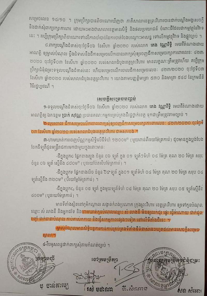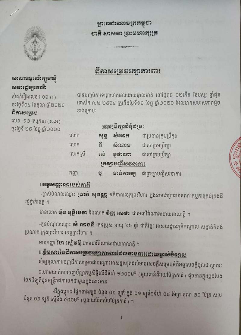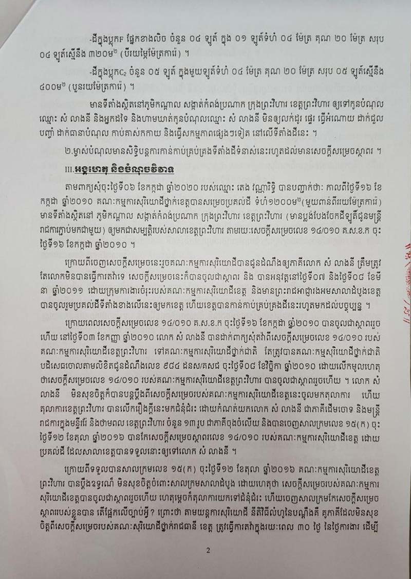រដ្ឋបាលខេត្តព្រះវិហារ សុំធ្វើការជម្រាបជូនសាធារណជន និងម្ចាស់គណនីហ្វេសប៊ុកទាំងបីខាងលើឱ្យបានជ្រាបថា ក្រោយពីមានការអនុវត្តសាលដីការបស់តុលាការកំពូលលេខ១១៥ «ទ» ចុះថ្ងៃទី០៦ ខែមេសា ឆ្នាំ២០២០ រួចរាល់ គណៈកម្មាធិការគ្រប់គ្រងដីរដ្ឋថ្នាក់ខេត្ត បានដាក់ពាក្យបណ្ដឹងជាថ្មី ទាមទារដីដែលមានទីតាំងខាងលើមកធ្វើជាទ្រព្យសម្បត្តិរបស់រដ្ឋបាលខេត្តវិញ ហើយត្រូវបានសាលាដំបូងខេត្តព្រះវិហារ ដំណើរការអង្គ-សេចក្ដី ដោយបានធ្វើនីតិវិធីត្រៀមសម្រាប់ការទាញហេតុផលរួចរាល់ កាលពីថ្ងៃទី១៤ ខែកញ្ញា ឆ្នាំ២០២០ កន្លងទៅ។ ដោយសារដីខាងលើ កំពុងស្ថិតក្នុងដំណើរការនីតិវិធីនៃសំណុំរឿងរដ្ឋប្បវេណីលេខ៦៣ ចុះថ្ងៃទី០៧ ខែសីហា ឆ្នាំ២០២០ របស់សាលាដំបូងខេត្តព្រះវិហារ ដូច្នេះ មានន័យថា ដីខាងលើ គឺមិនទាន់ក្លាយជាកម្មសិទ្ធិរបស់ឈ្មោះ សំ លាងនី ឬរដ្ឋបាលខេត្តនៅឡើយទេ គឺត្រូវរង់ចាំសេចក្ដីសម្រេចជាស្ថាពរពីស្ថាប័នតុលាការសិន។ ទន្ទឹមនេះ រដ្ឋបាលខេត្តបានដាក់ពាក្យបណ្ដឹងសុំរក្សាការពារដីខាងលើនោះ ហើយត្រូវបានសាលាឧទ្ធរណ៍ត្បូងឃ្មុំ ចេញសាលដីកាសម្រេចរក្សាការពារ លេខ១២ រក.ក្រIII (ស.អ) ចុះថ្ងៃទី២៨ ខែធ្នូ ឆ្នាំ២០២០ ដោយមានខ្លឹមសារ ហាមឃាត់កូនបំណុលឈ្មោះ សំ លាងនី មិនឱ្យលក់ដូរ ផ្ទេរ ធ្វើអំណោយ ដាក់ជួល បញ្ចាំ ដាក់ធានាបំណុល កាប់គាស់កកាយ និងធ្វើសកម្មភាពផ្សេងៗទៀត នៅលើទីតាំងដីនេះ និងឱ្យម្ចាស់បំណុល ដែលតំណាងដោយ ឯកឧត្ដមអភិបាលខេត្តព្រះវិហារ ក្នុងនាមជាប្រធានគណៈកម្មាធិការគ្រប់គ្រងដីរដ្ឋថ្នាក់ខេត្ត មានសិទ្ធិបន្តការកាន់កាប់គ្រប់គ្រងទីតាំងដីទំនាស់នេះ រហូតដល់មានសេចក្ដីសម្រេចស្ថាពរ។