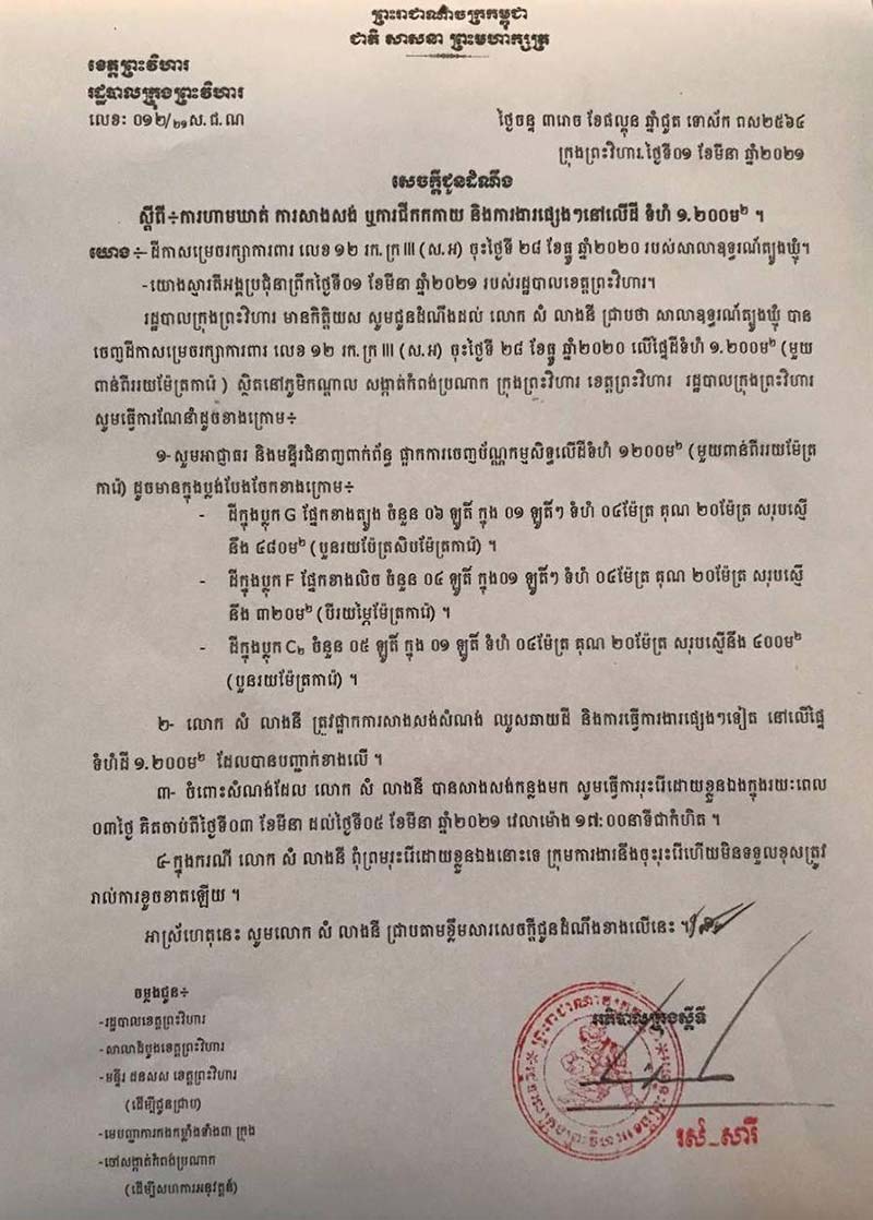 ស្រាប់តែនៅថ្ងៃទី២២ ខែកុម្ភៈ ឆ្នាំ២០២១ ឈ្មោះ សំ លាងនី បានធ្វើការសាងសង់សំណង់នៅលើដីទំនាស់ខាងលើដែលកំពុងស្ថិតក្នុងនីតិវិធីតុលាការ ដោយពុំមានច្បាប់អនុញ្ញាតសាងសង់ឡើយ។ ដើម្បីអនុវត្តច្បាប់ អាជ្ញាធរក្រុងព្រះវិហារ បានចេញលិខិតជូនដំណឹងឱ្យឈ្មោះ សំ លាងនី រុះរើសំណង់ខុសច្បាប់ ដោយខ្លួនឯង ដោយទុករយៈពេល ៣ថ្ងៃ ប៉ុន្តែបុគ្គលរូបនេះ នៅតែផ្គើនមានះ បន្តធ្វើសំណង់ខុសច្បាប់ដដែល។ មិនត្រឹមតែប៉ុណ្ណោះ បុគ្គលរូបនេះ និងគ្រួសារ បានចុះផ្សាយក្នុងគណនីហ្វេសប៊ុកទាំងបីខាងលើ ដោយបានប្រើពាក្យអសុរោះគ្មានក្រមសីលធម៌ រិះគន់មកលើមន្ត្រីរាជការ អាជ្ញាធរក្រុង និងអាជ្ញាធរខេត្តព្រះវិហារ ដែលជាហេតុធ្វើឱ្យប៉ះពាល់ដល់កិត្តិយស និងសេចក្ដីថ្លៃថ្នូររបស់មន្ត្រីរាជការសាធារណៈ ថ្នាក់ដឹកនាំ និងស្ថាប័នរដ្ឋ។