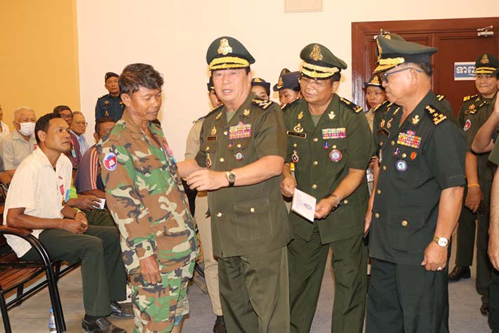 (សៀមរាប)៖ នាយឧត្តមសេនីយ៍ ឥត សារ៉ាត់ អគ្គមេបញ្ជាការរង នាយសេនាធិការចម្រុះនៃកងយោធពលខេមរភូមិន្ទ អគ្គលេខាធិការរងសមាគមអតីតយុទ្ធជនកម្ពុជា នៅព្រឹកថ្ងៃទី០៩ ខែមិថុនា ឆ្នាំ២០២៣នេះ បានអញ្ជើញជួបសំណេះសំណាល និងបំពាក់មេដាយការពារជាតិ ជូនអតីតយុទ្ធជន ក្នុងខេត្តសៀមរាបចំនួន២០០នាក់។