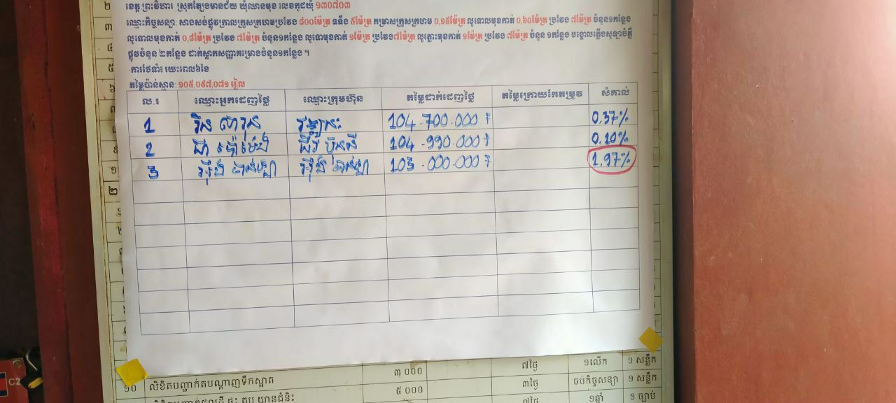 ព្រះវិហារ៖ ក្រុមហ៊ុនដេញថ្លៃគម្រោងសាងសង់បានរិះគន់ចំពោះដំណើរការនានារបស់គណៈកម្មការដេញថ្លៃថវិកាឃុំសង្កាត់ ពាក់ព័ន្ធនិងកក់ប្រាក់មានធនាគារតែមួយគត់ ដែលខុសពីបណ្តាខេត្តនានាទូទាំងប្រទេស ដែលអាចកក់ប្រាក់បាននៅធនាគារផ្សេងច្រើនទៀត។
