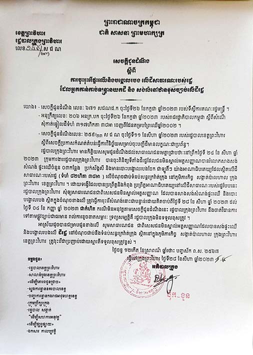 ព្រះវិហារ៖ រដ្ឋបាលក្រុងព្រះវិហារចេញសេចក្ដីជូនដំណឹងដល់សាធារណៈជនជាពិសេសមិនស្គាល់អត្តសញ្ញាណដែលបានសាសាងសំណង់ផ្ទះឈើនិងរបងស្ថិតនៅចំណុចកូនភ្នំ ភូមិភារកិច្ច សង្កាត់ប៉ាលហាល ក្រុងព្រះវិហារ ខេត្តព្រះវិហារ ត្រូវធ្វើការរុះរើសំណង់ជាបន្ទាន់ដោយគិតចាប់ពីថ្ងៃ ទី២៨ ខែសីហា ឆ្នាំ២០២៣ដល់ថ្ងៃ ទី៤ ខែកញ្ញា ឆ្នាំ២០២៣ ជាកំហិត ក្នុងករណីមិនអនុវត្តតាមសេចក្ដីជូនដំណឹងនេះ រដ្ឋបាលក្រុងព្រះវិហារ និងចាត់វិធានការទៅតាមផ្លូវច្បាប់ជាធរមានរាល់ការខូចខាតសម្ភារៈទ្រព្យសម្បាត្តិ គឺរដ្ឋបាលក្រុងមិនទទួលខុសត្រូវឡើយ។