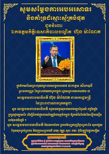 ព្រះវិហារ៖ ឯកឧត្តម ឧត្ដមសេនីយ៏ទោ ជូ តុងអាន មេបញ្ចាការរងកងពលធំអន្តរាគមនលេខ៣ កងទ័ពជើងគោក ព្រមទាំងក្រុមគ្រួសារ សូមអបអរសាទរដោយស្មោះជូនចំពោះ ឯកឧត្ត កិត្តិទេសាភិបាលបណ្ឌិត ហ៊ុន ម៉ាណែត ដែលត្រូវបាន ព្រះករុណា ព្រះបាទ សម្តេចព្រះ បរមនាថ នរោត្តម សីហមុនី ព្រះមហាក្សត្រនៃកម្ពុជា ត្រាស់ ព្រះរាជទានគោរមងារ សម្ដេចមហាបវរធីបតីហ៊ុន ម៉ាណែត។