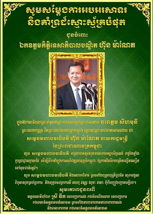 ព្រះវិហារ៖ ឯកឧត្តម ឧត្ដមសេនីយ៏ឯក ស្រី ឌឹក មេបញ្ចាការកងពលធំអន្តរាគមនលេខ៣ កងទ័ពជើងគោក ព្រមទាំងនាយ នាយទាហាន នាយទាហានរង ពលទាហាន ចំណុះទីបញ្ជាការទាំងមូល សូមអបអរសាទរដោយស្មោះជូនចំពោះ ឯកឧត្ត កិត្តិទេសាភិបាលបណ្ឌិត ហ៊ុន ម៉ាណែត ដែលត្រូវបាន ព្រះករុណា ព្រះបាទ សម្តេចព្រះ បរមនាថ នរោត្តម សីហមុនី ព្រះមហាក្សត្រនៃកម្ពុជា ត្រាស់ ព្រះរាជទានគោរមងារ សម្ដេចមហាបវរធីបតីហ៊ុន ម៉ាណែត។