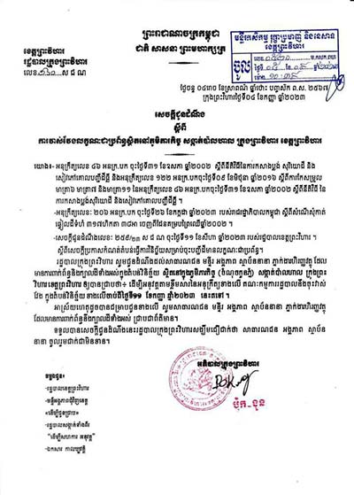 ព្រះវិហារ៖ សេចក្ដីជូនដំណឹងលេខៈ២៥៩/២៣ ស ជ ណ ចុះថ្ងៃ ទី១១ ខែសីហា ឆ្នំ២០២៣ របស់រដ្ឋបាលខេត្តព្រះវិហារ ស្ដីអំពីសេចក្ដីប្រកាសកំណត់តំបន់ធ្វើការវិនិច្ឆ័យសម្រាប់ចុះបញ្ជីដីធ្លីមានលក្ខណៈប្រព័ន្ធ រដ្ឋបាលក្រុងព្រះវិហារ សូមជូនដំណឹងដល់សាធារណជន មន្ទីរ អង្គភាព ស្ថាប័ននានា ភ្នាក់ងារហិរញ្ញវត្ថុ ដែលមានការពាក់ព័ន្ធនិងក្បាលដីទាំងអស់ក្នុងតំបន់វិនិច្ឆ័យ ស្ថិតនៅក្នុងភូមិភារកិច្ច (ចំណុចកូនភ្នំ)សង្កាត់ប៉ាលហាល ក្រុងព្រះវិហារ ខេត្តព្រះវិហារ ឱ្យបានជ្រាបថា÷ដើម្បីអនវត្តតាមខ្លឹមសារ នៃអនុក្រិត្យខាងលើគណៈកម្មការរដ្ឋបាលក្រុងព្រះវិហារនិងចុះវាស់វែងក្នុងតំបន់វិនិច្ឆ័យ ខាងលើចាប់ពីថ្ងៃ ទី១១ ខែកញ្ញា ឆ្នាំ២០២៣នេះតទៅ៕