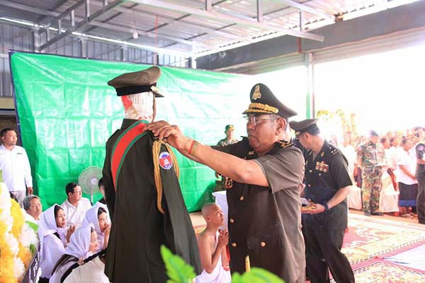 ព្រះវិហារ៖ នៅរសៀលថ្ងៃទី០៩ ខែតុលា ឆ្នាំ២០២៣ ឧត្តមសេនីយ៍ឯក ស្រី ឌឹក មេបញ្ជាការរង កងទ័ពជើងគោក មេបញ្ជាការ កងពលធំអន្តរាគមន៍លេខ៣ អញ្ជើញជាអធិបតី បំពាក់ឋានន្តរស័ក្តិបច្ឆាមរណៈកិត្តិយស ជូនសពឧត្តមសេនីយ៍ទោ ច័ន្ទ ណារឿន មេបញ្ជាការរង កងពលធំអន្តរគមន៍លេខ៣ ជាឧត្តមសេនីយ៍ឯក និងបានអញ្ជើញដឹកនាំសហការី មានមេបញ្ជាការរង នាយទាហាន នាហានរង ពលទាហាន កងពលធំអន្តរាគមន៍លេខ៣ និងមេបញ្ជាការរង នាយទាហាន នាយទាហានរង ពលទាហាន កងពលតូចអន្តរាគមន៍ចំណុះទាំង៣ កងកម្លាំងប្រដាប់អាវុធទាំង៣ប្រភេទ និងគ្រប់ស្ថាប័នចំណុះខេត្តព្រះវិហារ ដើម្បីចូលរួមរំលែកទុក្ខ ព្រមទាំងគោរពវិញ្ញាណក្ខន្ធ ជូនសព ឯកឧត្តម ច័ន្ទ ណារឿន មេបញ្ជាការរង កងពលធំអន្តរាគមន៍លេខ៣ ដែលបានទទួលមរណភាពក្នុងជន្មាយុ ៦០ឆ្នាំ ដោយរោគាពាធ កាលពីថ្ងៃសៅរ៍ ៨ រោច ខែភទ្របទ ឆ្នាំថោះបញ្ចស័ក ព.ស.២៥៦៧ ត្រូវនឹងថ្ងៃទី៧ ខែតុលា ឆ្នាំ២០២៣ វេលាម៉ោង ០៥:៥៣នាទីល្ងាច ពិធីនេះបានប្រារព្ធធ្វើនៅភូមិត្រពាំងសង្កែខាងកើត ឃុំស្រអែម ស្រុកជាំក្សាន្ត ខេត្តព្រះវិហារ ។