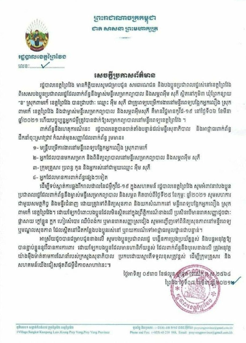 រដ្ឋបាលខេត្តព្រៃវែង នៅថ្ងៃទី០៧ ខែមីនា ឆ្នាំ២០២១នេះ បានចេញសេចក្តីជូនដល់ ប្រជាពលរដ្ឋ ដែលពាក់ព័ន្ធនឹងម្ចាស់មន្ទីរសម្រាកព្យាបាល និងសម្ភពអ៊ុម សុភី គិតចាប់ពីថ្ងៃទី២៥ ខែកុម្ភៈ ឆ្នាំ២០២១ សូមសហការជាមួយសមត្ថកិច្ច និងមន្ទីរជំនាញដោយត្រូវទៅពិនិត្យសុខភាព និងយកសំណាកនៅ មន្ទីរពេទ្យបង្អែកអ្នកលឿង ស្រុក ពាមរក៌ ខេត្តព្រៃវែង។