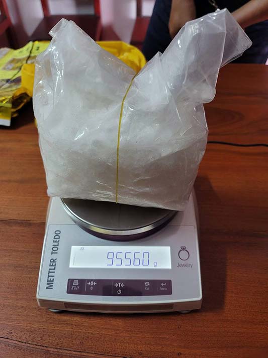 – ម្សៅក្រាមពណ៌សថ្លា ចំនួន ០១កញ្ចប់ធំ ទម្ងន់ : ៩៥៥,៦០ក្រាម ( ប្រាំបួនរយហាសឹបប្រាំក្បៀសហុកសឹបក្រាម ថ្នាំសុទ្ធ )។