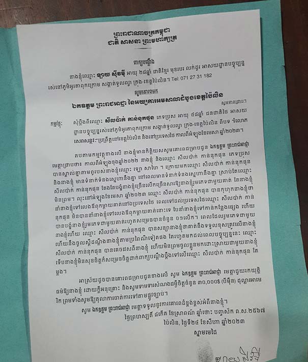 យោងតាមពាក្យបណ្តឹងរបស់នារីរងគ្រោះ បានឱ្យដឹងថា នាងបានដាក់ពាក្យបណ្តឹងទៅអយ្យការអមសាលាដំបូងខេត្តប៉ៃលិន សុំប្តឹងពីឈ្មោះ សីលប៉ាក់ កាន់នុកផុន ភេទប្រុស អាយុ៤៨ឆ្នាំ ជនជាតិថៃ ពីបទរំលោភសេពសន្ថវៈ ”ប្រព្រឹត្តនៅខេត្តប៉ៃលិន និងនៅប្រទេសថៃ កាលពីអំឡុងខែមេសា ឆ្នាំ២០២៣ ។