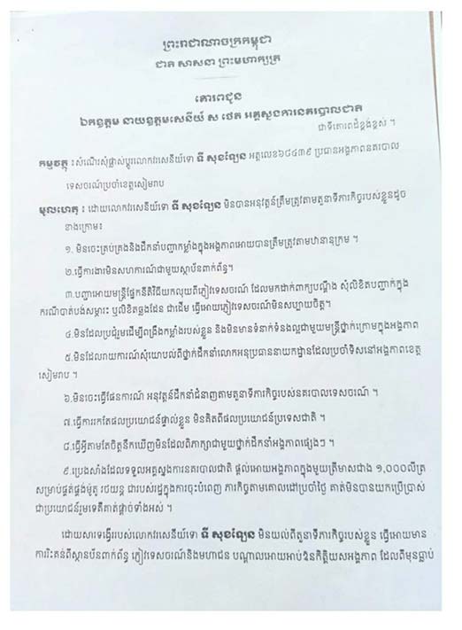 សៀមរាប៖ បែកធ្លាយព័ត៌មានចេញពីអង្គភាពនគរបាលទេសចរណ៍ប្រចាំខេត្តសៀមរាប ករណីមន្ត្រីជាច្រើននាក់ប្ដឹងលោកវរៈសេនីយ៍ទោ ទី សុខឡែន អត្តលេខ 684 39 តួនាទីជាប្រធានអង្គភាពនគរបាលទេសចរណ៍ប្រចាំខេត្តសៀមរាប ទៅឯកឧត្តមអគ្គស្នងការនគរបាលជាតិ៕