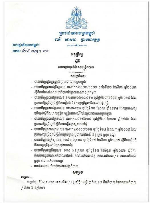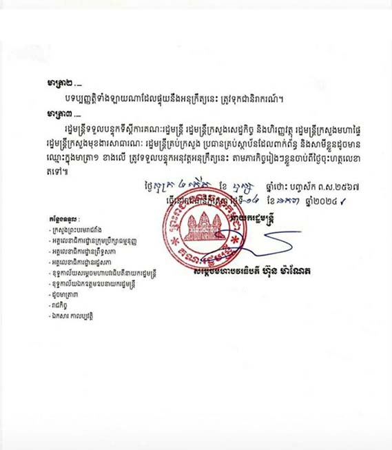 សម្តេចធិបតី ហ៊ុន ម៉ាណែត បានបង្ហោះអនុក្រឹត្យបញ្ចប់មុខតំណែង ជាមួយនឹងខ្លឹមសារទាំងស្រុងដូចខាងក្រោម៖