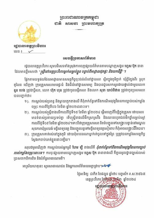 ព្រះវិហារ៖ អាជ្ញាធរខេត្តព្រះវិហារ បានចេញមកបញ្ជាក់ថា ពលរដ្ឋម្នាក់ដែលផឹកថ្នាំបាញ់ស្មៅសម្លាប់ខ្លួន នៅក្នុងភូមិក្តាក់ ឃុំស្រយង់ ស្រុកគូលែន កាលពីថ្ងៃទី១៥ ខែមីនា ឆ្នាំ២០២៤នោះ ផ្តើមចេញពីវិបត្តិគ្រួសារ ពុំពាក់ព័ន្ធទៅនឹងករណីអនុវត្តវិធានការច្បាប់ របស់កម្លាំងចម្រុះនោះទេ។ការចេញមកបញ្ជាក់ការពិតនេះ បានធ្វើឡើងបន្ទាប់ពីមានសារព័ត៌មានក្រៅប្រទេស រួមទាំងបណ្តាញសង្គមមួយចំនួនបានផ្សាយថាថា មានស្ត្រីម្នាក់រត់ចូលព្រៃ ហើយបានផឹកថ្នាំបាញ់ស្មៅសម្លាប់ខ្លួន ក្រោយអាជ្ញាធរបង្ក្រាបនៅក្រុមហ៊ុនសិលាដាម៉ិច។