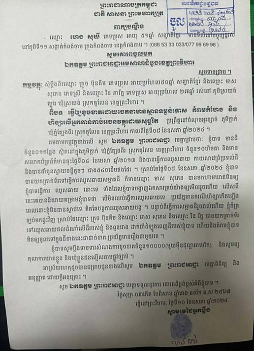 ព្រះវិហារ៖ ប្រជាពលរដ្ឋរស់នៅឃុំស្រយង់ ស្រុកគូលែន ខេត្តព្រះវិហារប្រមាណ១០គ្រួសារ បានលើកឡើងថា មានបុគ្គលម្នាក់ឈ្មោះ ក្រូច ប៊ុនគីម ជាមន្ត្រីយោធាពាក់សក្តិ៣ មានតួរនាទីជាដឺបេ បម្រើការក្នុងអង្គភាពយោធភូមិភាគទី៤ បានប្រើគ្រឿងចក្រឈូសឆាយដីព្រៃសហគមន៍ និងរំលោភយកដីរបស់ពួកគាត់ទាំង ដែលដីរបស់ពួកគាត់មានសលាកបត្រទៀតផង។