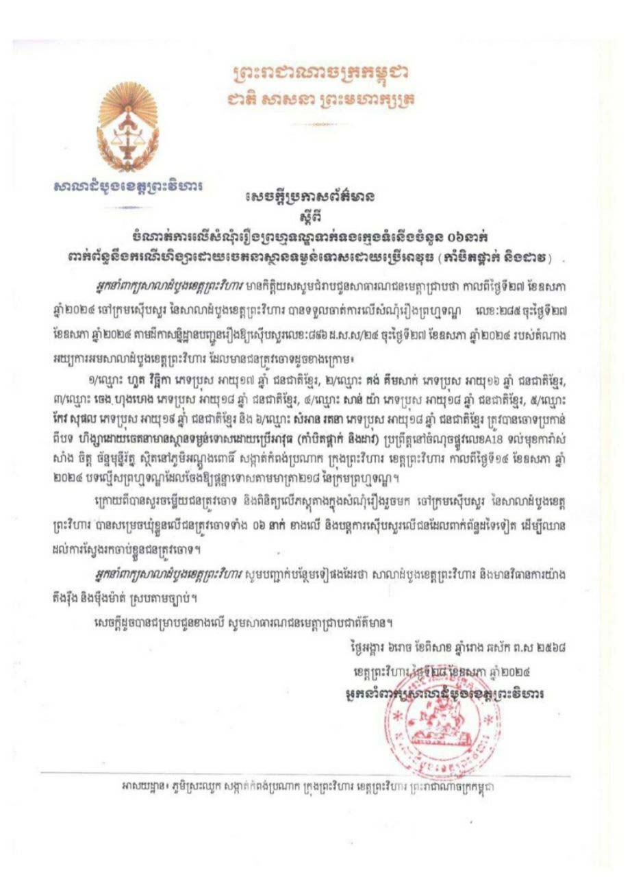 សូមបញ្ជាក់ថា ក្រុមក្មេងទំនើងទាំង៨នាក់នេះ ត្រូវបានកម្លាំងនគរបាលខេត្តព្រះវិហារ ក្រោមបទបញ្ជាដ៏ម៉ឺងម៉ាត់របស់លោកឧត្តមសេនីយ៍ទោ សួស សុខដារ៉ា ស្នងការនគរបាលខេត្ត ស្រាវជ្រាវ និងឃាត់ខ្លួនកាលពីថ្ងៃទី២៤ ខែឧសភា ឆ្នាំ២០២៤ ចំនួន២ករណីផ្សេងគ្នា។