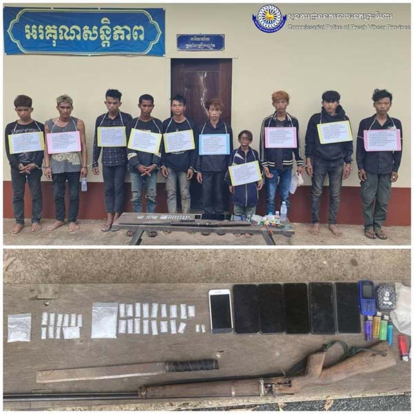 ( ព្រះវិហារ ) លោកឧត្ដមសេនីយ៍ទោ សួស សុខ ដារ៉ា ស្នងការនគរបាលខេត្តព្រះវិហារ បានពង្រឹង និងជម្រុញឲ្យកម្លាំងជំនាញយកចិត្តទុកដាក់ក្នុងការអនុវត្តផែនការប្រយុទ្ធប្រឆាំងបទល្មើសគ្រឿងញៀនខុសច្បាប់លើទី៩របស់រាជរដ្ឋាភិបាល ជាលទ្ធផលថ្មីៗនេះបង្រ្កាបជាក់ស្ដែងក្មេងទំនើងញៀនថ្នាំនៅស្រុកជាំក្សាន្ត កាលពីថ្ងៃ ទី២៨ ខែឧសភា ឆ្នាំ២០២៤ វេលាម៉ោង ២៣ និង ៤៥ នាទី កម្លាំងផ្នែកប្រឆាំងគ្រឿងញៀន នៃអធិការដ្ឋាននគរបាលស្រុកជាំក្សាន្ត សហការជាមួយកម្លាំងប៉ុស្តិ៍នគរបាលរដ្ឋបាលរំដោះស្រែ ប៉ុស្តិ៍នគរបាលរដ្ឋបាលជាំក្សាន្ត ប៉ុស្តិ៍នគរបាលរដ្ឋបាលស្រអែម និងប៉ុស្តិ៍នគរបាលរដ្ឋបាលកន្ទួត បានបង្រ្កាបករណីរក្សាទុក ជួញដូរ និងប្រើប្រាស់ដោយខុសច្បាប់នូវសារធាតុញៀន ប្រព្រឹត្តនៅចំណុចផ្លូវគ្រួសក្រហម ស្ថិតក្នុងភូមិគោក ឃុំរំដោះស្រែ ស្រុកជាំក្សាន្ត ខេត្តព្រះវិហារ។ សមត្ថកិច្ចយើងបានធ្វើការឃាត់ខ្លួនជនសង្ស័យចំនួន១០នាក់(ប្រុស) រឹបអូសបានវត្ថតាងចាប់យក៖