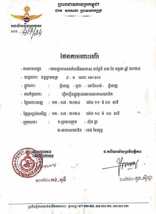 តាមរយៈ លិខិត ស្ដីពីផែនការហោះហើរ របស់កងទ័ពអាកាសនៃក្រសួងការពារជាតិ លេខ៤១៧ /២៤ ដែលបានចែកចាយជាសាធារណៈ នាថ្ងៃ១៣ កក្កដានេះ បានបញ្ជាក់ថា ឧទ្ធម្ភាគចក្រZ-9 លេខ MH912 ត្រូវមានជើងហោះហើរ ពីភ្នំពេញ -ថ្មដារ-ពោធិ៍សាតិ – ភ្នំពេញ ក្នុងភារកិច្ចហ្វឹកហ្វឺនផ្លូវឆ្ងាយឱ្យអាកាសយានិក ដែលចេញដំណើរពីម៉ោង១១ថ្ងៃត្រង់ ថ្ងៃទី១២កក្កដា និងត្រូវវិលត្រឡបមកវិញ នៅម៉ោង១៤ រសៀលថ្ងៃដដែល។ ប៉ុន្តែជាអកុសល ឧទ្ធម្ភាគចក្រZ-9 លេខ MH912 ដែលដឹកនាំ ដោយ ឈ្មោះ ស៊ុន ផ្លា ប្រធានក្រុម និងឈ្មោះ ខេង ឆៃយុទ្ធ ជាអាកាសយានិក ត្រូវបានបាត់ការទាក់ទង និងពុំមានការបញ្ជាក់ ពីមូលហេតុឡើយ ។