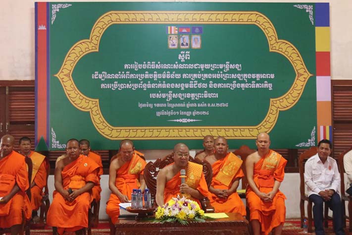ព្រះវិហារ៖ នារសៀលថ្ងៃទី១ ខែកញ្ញា ឆ្នាំ២០២៤ សម្ដេចព្រះឧត្ដមវង្សា កិត្តិបណ្ឌិត មួង រ៉ា សម្ដេចព្រះសង្ឃនាយករងទី៣ តំណាងដ៏ខ្ពង់ខ្ពស់ សម្ដេចព្រះពោធិវ័ង្ស កិត្តិបណ្ឌិត អំ លីមហេង សម្ដេចព្រះសង្ឃនាយកស្ដីទី និង លោក លន់ មុនីរតនា រដ្ឋលេខាធិការ តំណាងដ៏ខ្ពង់ខ្ពស់ ឯកឧត្តមបណ្ឌិត ចាយ បូរិន រដ្ឋមន្រ្តីក្រសួងធម្មការនិងសាសនា លោក សុខ សាន្តតារា តំណាងដ៏ខ្ពង់ខ្ពស់ លោក គីម រិទ្ធី អភិបាល នៃគណៈអភិបាលខេតព្រះវិហារ បាននិមន្ត និងអញ្ជើញចុះសំណេះសំណាល និងផ្ដល់ឱវាទដល់ព្រះមន្រ្តីសង្ឃក្នុងសាលាគណខេត្តព្រះវិហារ ស្ថិតនៅក្នុងវត្តប្រាសាទគោកបេង ភូមិគោកបេង សង្កាត់កំពង់ប្រណាក់ ក្រុងព្រះវិហារ ខេត្តព្រះវិហារ ដែលមានការចូលរួមពីសំណាក់ព្រះមន្រ្តីសង្ឃ គណៈកម្មការ អាចារ្យ សរុបចំនួន ៤០០អង្គ/នាក់។