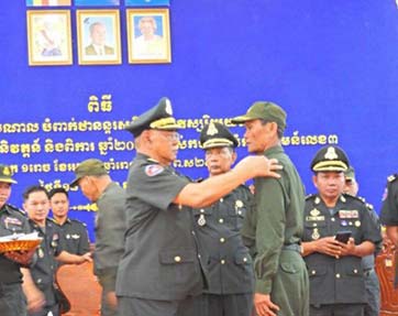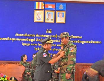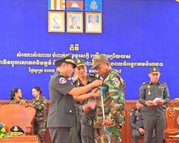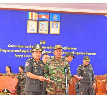 ព្រះវិហា៖ឧត្តមសេនីយ៍ឯក ស្រី ឌឹក មេបញ្ជាការរងកងទ័ពជើងគោក តំណាងនាយឧត្តមសេនីយ៍ ម៉ៅ សុផាន់ អគ្គមេបញ្ជាការ រងនៃកងយោធពលខេមរភូមិន្ទ និងជាមេបញ្ជាការកងទ័ពជើងគោគ នៅចុងសប្ដាហ៍នេះ បានអញ្ជើញបំពាក់ឋានន្តរស័ក្តិ និងគ្រឿងឥស្សរិយយស ជូនយោធិនចូលសោធននិវត្តន៍ និងពិការឆ្នាំ២០២៤ចំនួន៤០៨រូប ចំណុះកងពលធំអន្តរាគមន៍ លេខ៣ ដែលត្រូវផ្ទេរចេញពីក្របខ័ណ្ឌ ក្រសួងការពារជាតិ ទៅក្រសួងសង្គមកិច្ច អតីតយុទ្ធជន និងយុវនិតិសម្បទា ។