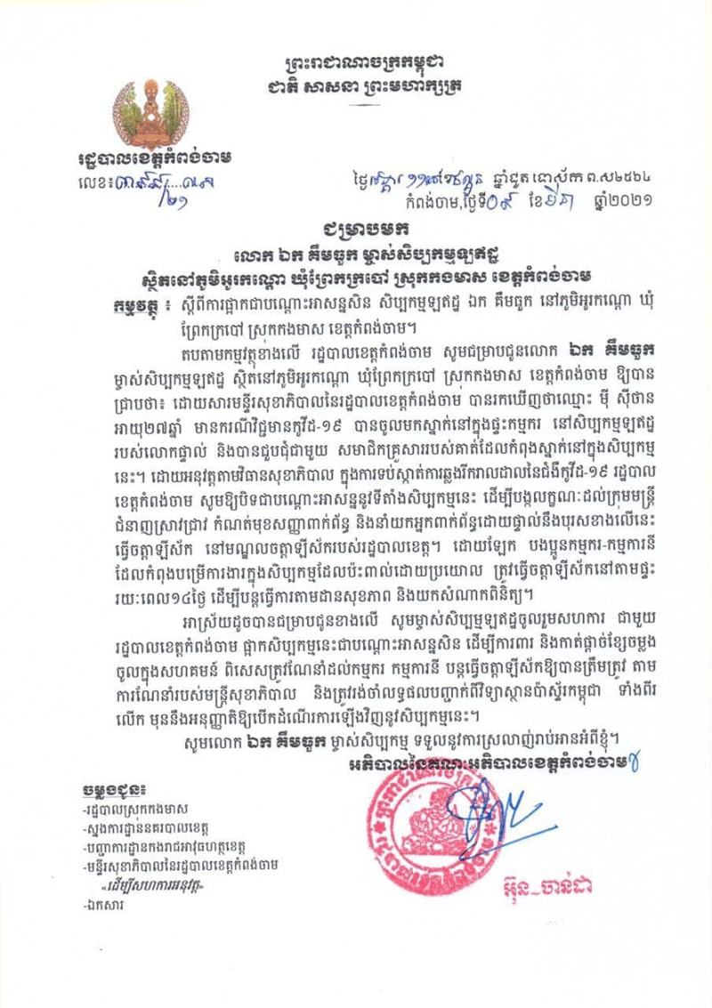 កំពង់ចាម : ដោយសារមន្ទីរសុខាភិបាលនៃរដ្ឋបាលខេត្តកំពង់ចាម បានរកឃើញ បុរស ម្នាក់ ឈ្មោះ ម៉ី ស៊ីថាន អាយុ២៧ឆ្នាំ មានករណី វិជ្ជមានកូវីដ-១៩ បានចូលមកស្នាក់នៅក្នុងផ្ទះកម្មករ និងបាន ជួបជុំជាមួយ សមាជិកគ្រួសាររបស់គាត់ ដែលកំពុងស្នាក់នៅក្នុងសិប្បកម្មឡឥដ្ឋ ស្ថិតនៅ ក្នុង ភូមិអូរកណ្តោរ ឃុំព្រែកក្របៅ ស្រុកកងមាស ខេត្តកំពង់ចាម ។ ដើម្បី អនុវត្តតាមវិធានសុខាភិបាល ក្នុងការទប់ស្កាត់ការឆ្លងរីករាលដាលនៃជំងឺកូវីដ-១៩ កាលពី ថ្ងៃទី ៩ ខែមិនា ឆ្នាំ ២០២១ នេះ រដ្ឋបាលខេត្តកំពង់ចាម សម្រេច បិទជាបណ្តោះអាសន្ននូវទីតាំង សិប្បកម្ម ឡឥដ្ឋ ខាងលើ ដើម្បីបង្កលក្ខណៈដល់ក្រុមមន្ត្រី ជំនាញស្រាវជ្រាវ កំណត់មុខសញ្ញាពាក់ព័ន្ធ និងនាំយក អ្នកពាក់ព័ន្ធ ដោយផ្ទាល់នឹងបុរសខាងលើនេះ ធ្វើចត្តាឡីស័ក នៅមណ្ឌលចត្តាឡីស័ក របស់រដ្ឋបាលខេត្ត។ ដោយឡែក បងប្អូនកម្មករ-កម្មការនី ដែលកំពុងបម្រើការងារក្នុងសិប្បកម្មដែលប៉ះពាល់ ដោយ ប្រយោល ត្រូវធ្វើចត្តាឡីស័កនៅតាមផ្ទះ រយៈពេល១៤ថ្ងៃ ដើម្បីបន្តធ្វើការតាមដានសុខភាព និងយកសំណាកពិនិត្យផងដែរ ។ ជាមួយគ្នា នោះ រដ្ឋបាល ខេត្តកំពង់ចាម ក៏បាន សូម ឲ្យ ម្ចាស់សិប្បម្មឡឥដ្ឋចូលរួមសហការ ជាមួយ រដ្ឋបាលខេត្ត ផ្អាកសិប្បកម្មនេះជាបណ្តោះអាសន្នសិន ដើម្បីការពារ និងកាត់ផ្តាច់ខ្សែចម្លង ចូលក្នុងសហគមន៍ ពិសេសត្រូវណែនាំដល់កម្មករ កម្មការនី បន្តធ្វើចត្តាឡីស័ក ឲ្យ បានត្រឹមត្រូវ តាមការណែនាំរបស់មន្ត្រីសុខាភិបាល និងត្រូវរង់ចាំ លទ្ធផល បញ្ជាក់ ពីវិទ្យាស្ថានប៉ាស្ទ័រកម្ពុជា ទាំងពីរលើក មុននឹងអនុញ្ញាតិ ឲ្យ បើកដំណើរការសិប្បកម្ម នេះឡើងវិញ ៕