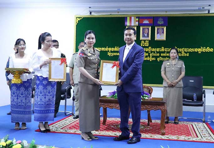 ខេត្តប៉ៃលិន ៖ នៅសាលប្រជុំមន្ទីរសុខាភិបាល នារសៀលថ្ងៃទី២៨ ខែវិច្ឆិកា ឆ្នាំ២០២៤ លោកជំទាវបណ្ឌិត បាន ស្រីមុំ អភិបាល នៃគណៈអភិបាលខេត្តប៉ៃលិន បានអញ្ជើញជាអធិបតីក្នុងពិធីប្រកាសចូលកាន់មុខតំណែងមន្ត្រីរាជការមន្ទីរសុខាភិបាល នៃរដ្ឋបាលខេត្តប៉ៃលិន ដោយមានការចូលរួមពីសំណាក់ប្រធានមន្ទីរអង្គភាពជំនាញជុំវិញខេត្តផងដែរ។