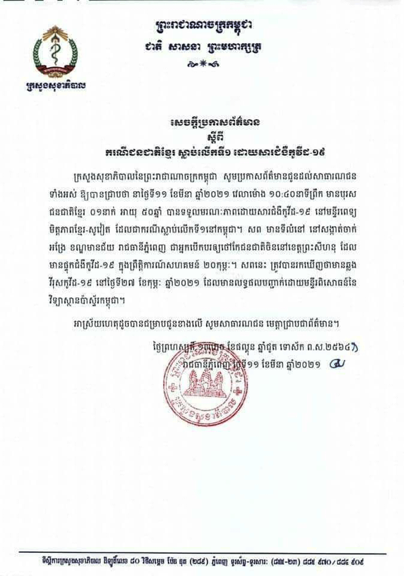តាមការបញ្ជាក់ពីក្រសួងសុខាភិបាលបានអោយដឹងថា បុរសជាជនជាតិខ្មែរអាយុ ៥០ឆ្នាំបានទទួលមរណៈភាពនៅមន្ទីរពេទ្យ មិត្តភាពខ្មែរសូវៀត (ពេទ្យរុស្ស៊ី) ដែលនេះជាករណីស្លាប់លើកទី១ នៅក្នុងប្រទេសកម្ពុជា។សពមានទីតាំង នៅសង្កាត់ចាក់អង្រែ ខណ្ឌមានជ័យ រាជធានីភ្នំពេញ ជាអ្នកបើកបររថយន្ដឲ្យថៅកែជនជាតិចិន នៅខេត្ដព្រះសីហនុ ដែលមានផ្ទុកជំងឺកូវីដ១៩ ក្នុងព្រឹត្ដិការណ៍សហគមន៍ ២០ កុម្ភៈ ។ សពនេះ ត្រូវបានរកឃើញថាមានឆ្លងវីរុសកូវីដ១៩ នៅថ្ងៃទី២៧ ខែកុម្ភៈ ឆ្នាំ២០២១ ដេលមានលទ្ធផលបញ្ជាក់ដោយមន្ទីរពិសោធន៍ នៃវិទ្យាស្ថានប៉ាស្ទ័រកម្ពុជា។
