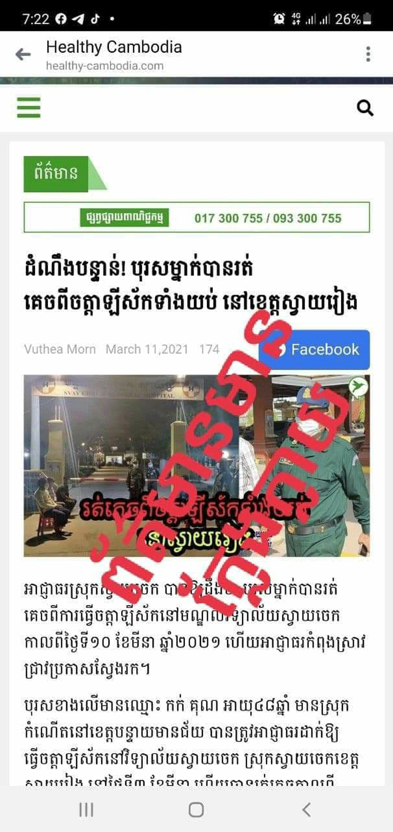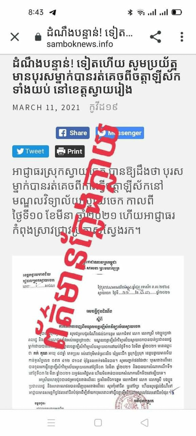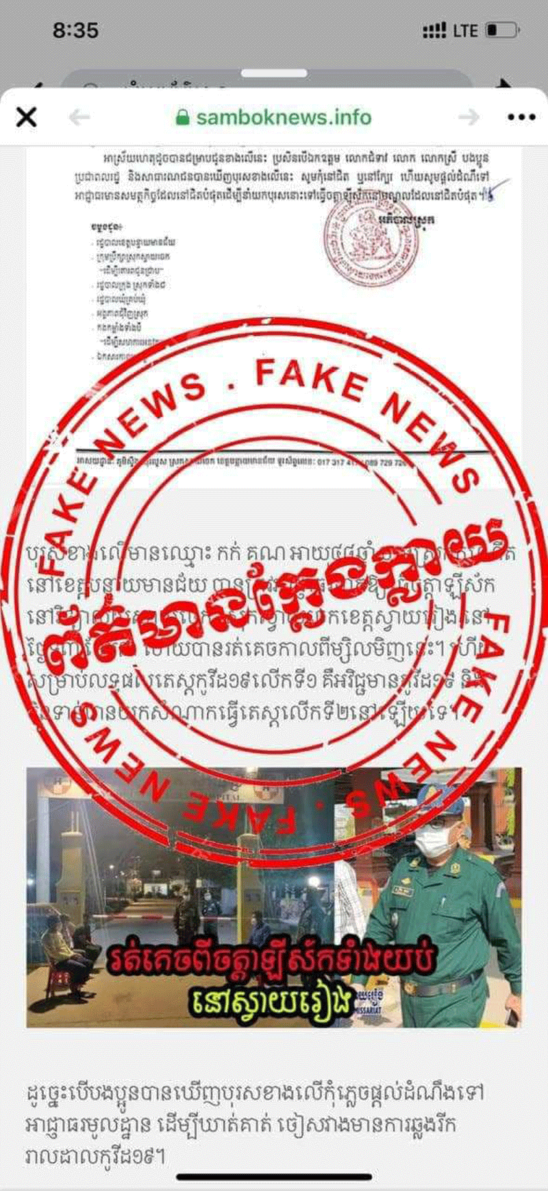 ខេត្តស្វាយរៀង៖យោងតាមរដ្ឋបាលខេត្តស្វាយរៀង សូមធ្វើការបដិសេធ និងច្រានចោលនូវ ព័ត៌មានមិនពិតដែលធ្វើឲ្យសាធារណជនមានការយល់ច្រឡំជុំវិញករណីថាមានអ្នករត់ចេញពីមណ្ឌលចត្តាឡីស័ក ដែលតាមខ្លឹមសារ និងលិខិតជូនដំណឹងដែលព័ត៌មានមួយចំនួនបានចុះផ្សាយជារឿង មិនពិត ជាក់ស្តែងស្រុកស្វាយចេក មិនមាននៅក្នុងខេត្តស្វាយរៀងនោះទេ។