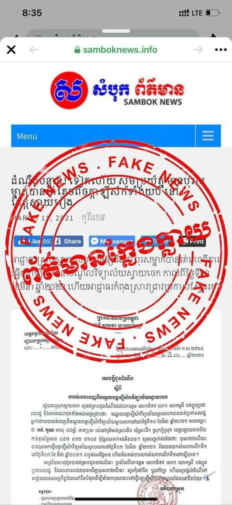 សូមប្រុងប្រយ័ត្នការចែករំលែកព័ត៌មានដែលគ្មានប្រភពច្បាស់លាស់ អាចប្រឈមនឹងផ្លូវច្បាប់ ។