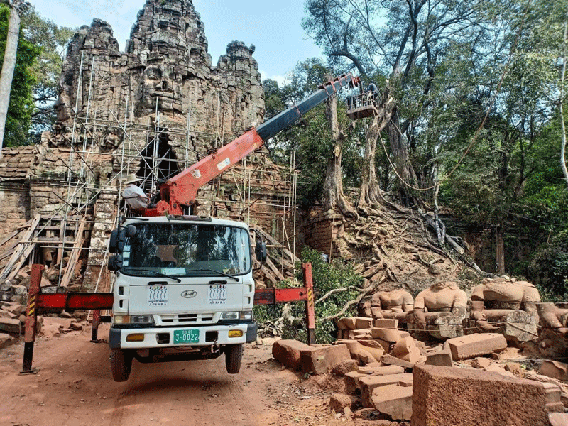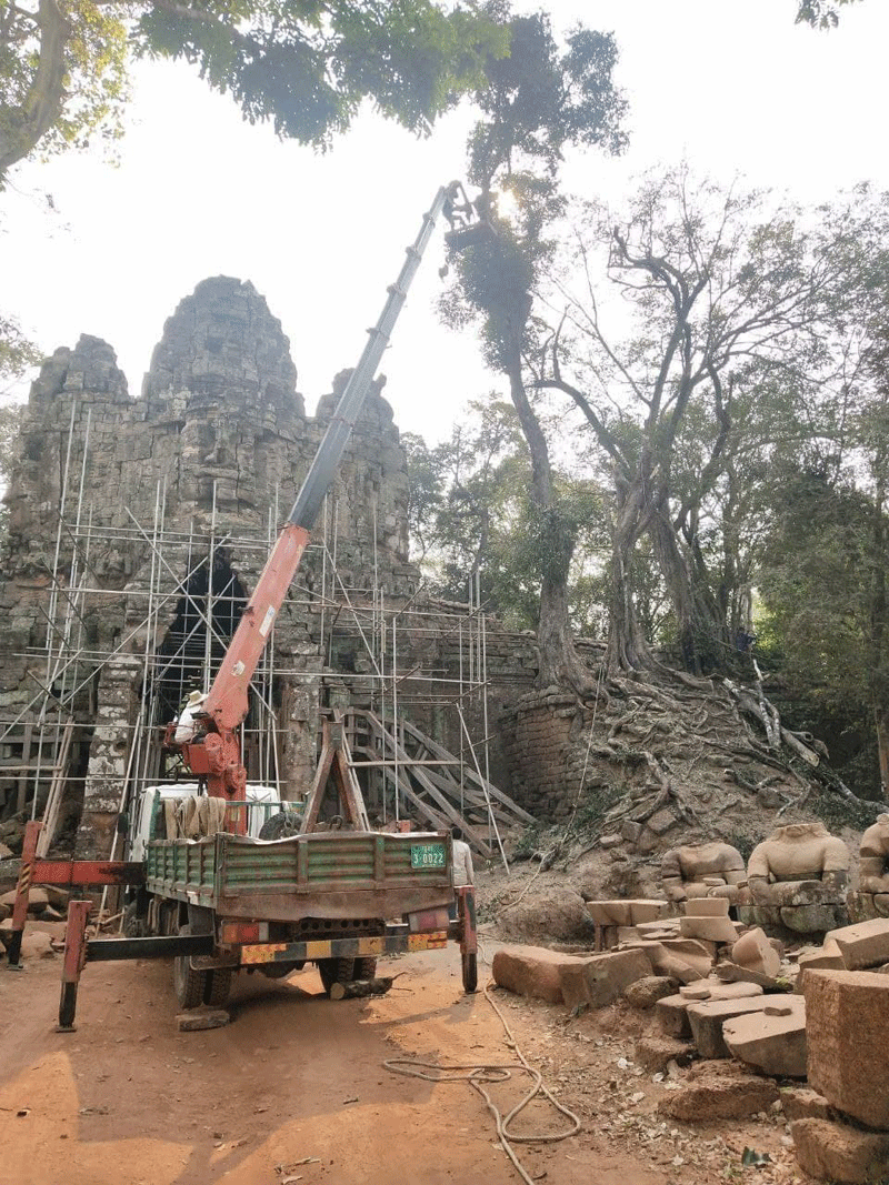 សៀមរាប៖ក្រុមជំនាញនៃនាយកដ្ឋានគ្រប់គ្រងព្រៃឈើ ទេសភាពវប្បធម៌ និងបរិស្ថាន និងនាយកដ្ឋាន អភិរក្សប្រាសាទក្នុងឧទ្យានអង្គរ និងបុរាណវិទ្យាបង្ការនៃអាជ្ញាធរជាតិអប្សរា រួមជាមួយផ្នែកពាក់ព័ន្ធ បានចុះពិនិត្យ និងកំពុងអនុវត្តវិធានការបន្ទាន់ចំពោះដើមឈើ ហានិភ័យខ្ពស់មកលើរចនាសម្ពន្ធខ្លោង ទ្វារតាកាវនៃក្រុងអង្គរធំ។ ការងារនេះធ្វើឡើង ដើម្បីធានាសុវត្តិភាពអ្នកដំណើរដែលឆ្លងកាត់ទីនោះ ជៀសវាងគ្រោះថ្នាក់ប៉ះពាល់ដល់អាយុជីវិតនិងបង្ការកុំឲ្យប៉ះពាល់ដល់រចនាសម្ពន្ធប្រាសាទកាន់តែធ្ងន់ធ្ងរ ដែលការងារនេះនឹងជួយសម្រួលដល់កិច្ចការអភិរក្ស និងជួសជុលខ្លោងទ្វារតាកាវ ដែលគ្រោងនឹង អនុវត្តក្នុងពេលឆាប់ៗនេះ។