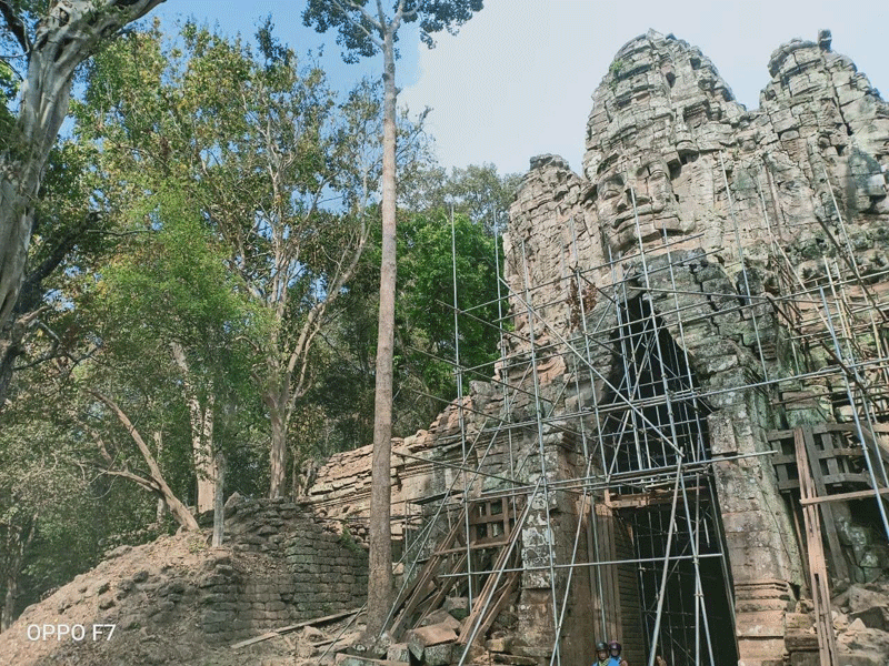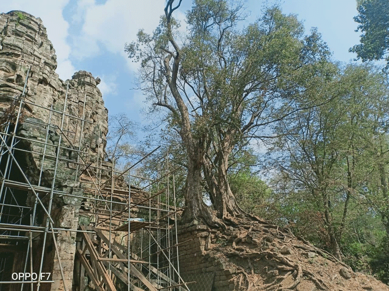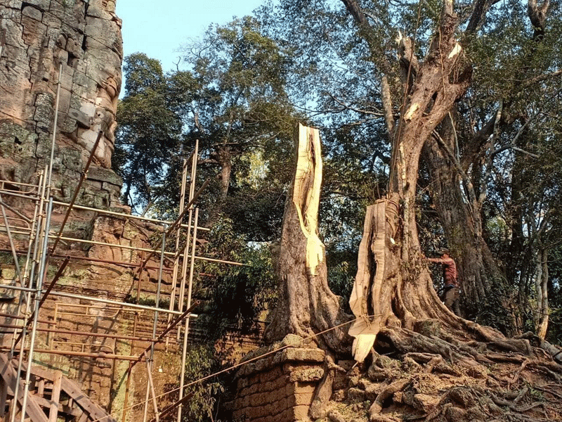 ដើមឈើដែលបាន និងកំពុងកាត់ដកហូតចេញមានចំនួន៨ដើមរួមមាន ដើមចាន់៣ដើម ដើមយាង១ដើម ស្នាយ២ដើម អង្កោល១ដើម និងស្លែង១ដើម ដែលស្ថានភាពដើមឈើទាំងនោះ ដុះទ្រេតនៅលើខឿនថ្មបាយក្រៀម មានជំងឺ និងប្រព័ន្ធឬសខ្សោយចាក់ចូលក្នុងរចនាសម្ព័ន្ធខ្លោងទ្វារ។ ចំណែកឯដើមឈើដែលកំពុងកាត់ក្រីមែកមានចំនួន៤ដើមរួមមាន ដើមចាន់៣ដើម និងស្លែង១ដើម ដុះទ្រេតលើកំពែង ដែលត្រូវកាត់ក្រីចំនួន៩មែកចេញ ដើម្បីសម្រាលតួដើមឈើទាំងនោះ និងជួយសម្រួលដល់ការងារជួសជុលឲ្យបានលឿនផង៕ដោយតាំង ហូ