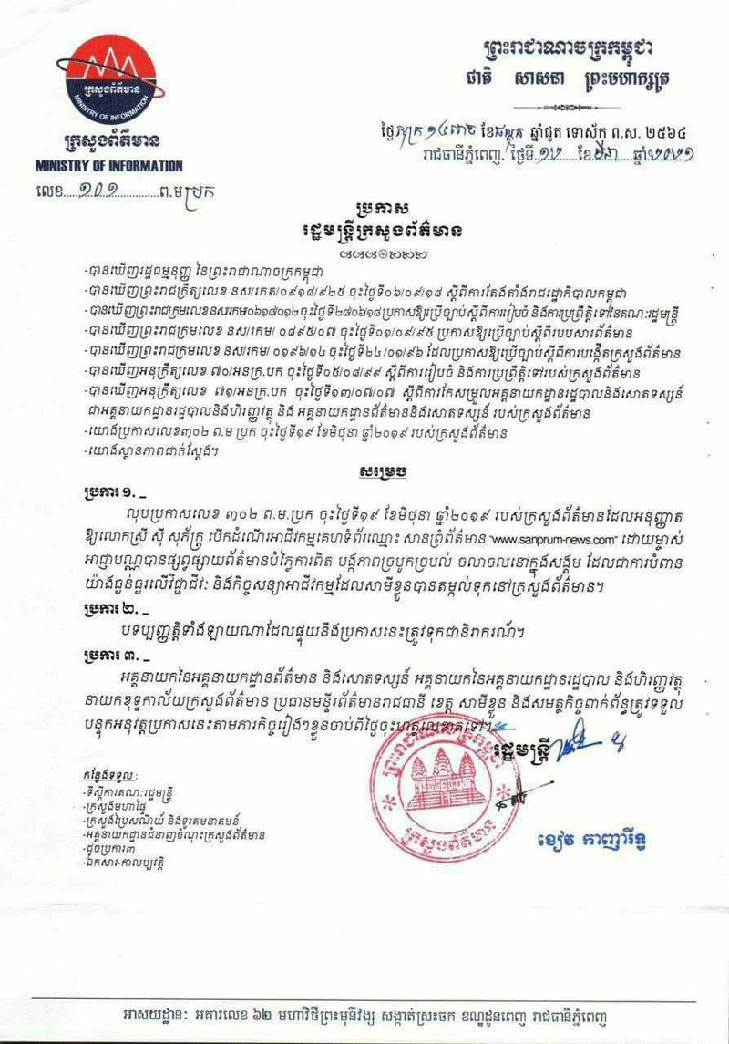 ការសម្រេចលុបចោលនេះ ក៏ដោយសារក្រសួងព័ត៌មានបានចាត់ទុកថា គេហទំព័រទាំង២នេះ បានផ្សព្វផ្សាយព័ត៌មានបំភ្លៃការពិត បង្កភាពច្របូកច្របល់ និងចលាចលនៅក្នុងសង្គម ដែលជាការបំពានយ៉ាងធ្ងន់ធ្ងរលើវិជ្ជាជីវៈ និងកិច្ចសន្យាអាជីវកម្មដែលសាមីខ្លួណបានតម្កល់ ទុកនៅក្រសួងព័ត៌មាន»៕