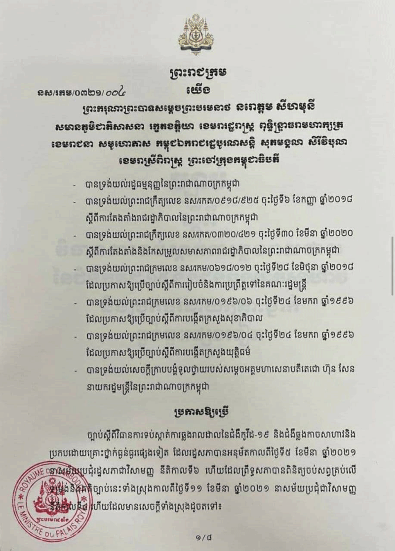 ភ្នំពេញៈ នៅវេលាម៉ោង ០៩ និង០០នាទីព្រឹកថ្ងៃចន្ទ ទី១៥ ខែមីនា ឆ្នាំ២០២១នេះ ក្រសួងសុខា ភិបាល រួមគ្នាជាមួយក្រសួងយុត្តិធម៌នឹងធ្វើសន្និសីទសារព័ត៌មានស្ដីពី“ ច្បាប់ស្ដីពីវិធានការ ទប់ស្កាត់ការឆ្លងរាលដាលនៃជំងឺកូវីដ-១៩ និងជំងឺឆ្លងកាចសាហាវ និងប្រកបដោយគ្រោះថ្នាក់ធ្ងន់ធ្ងរ ផ្សេងទៀត” ដែលនឹងប្រព្រឹត្តទៅនៅទីស្ដីការក្រសួងសុខាភិបាល។